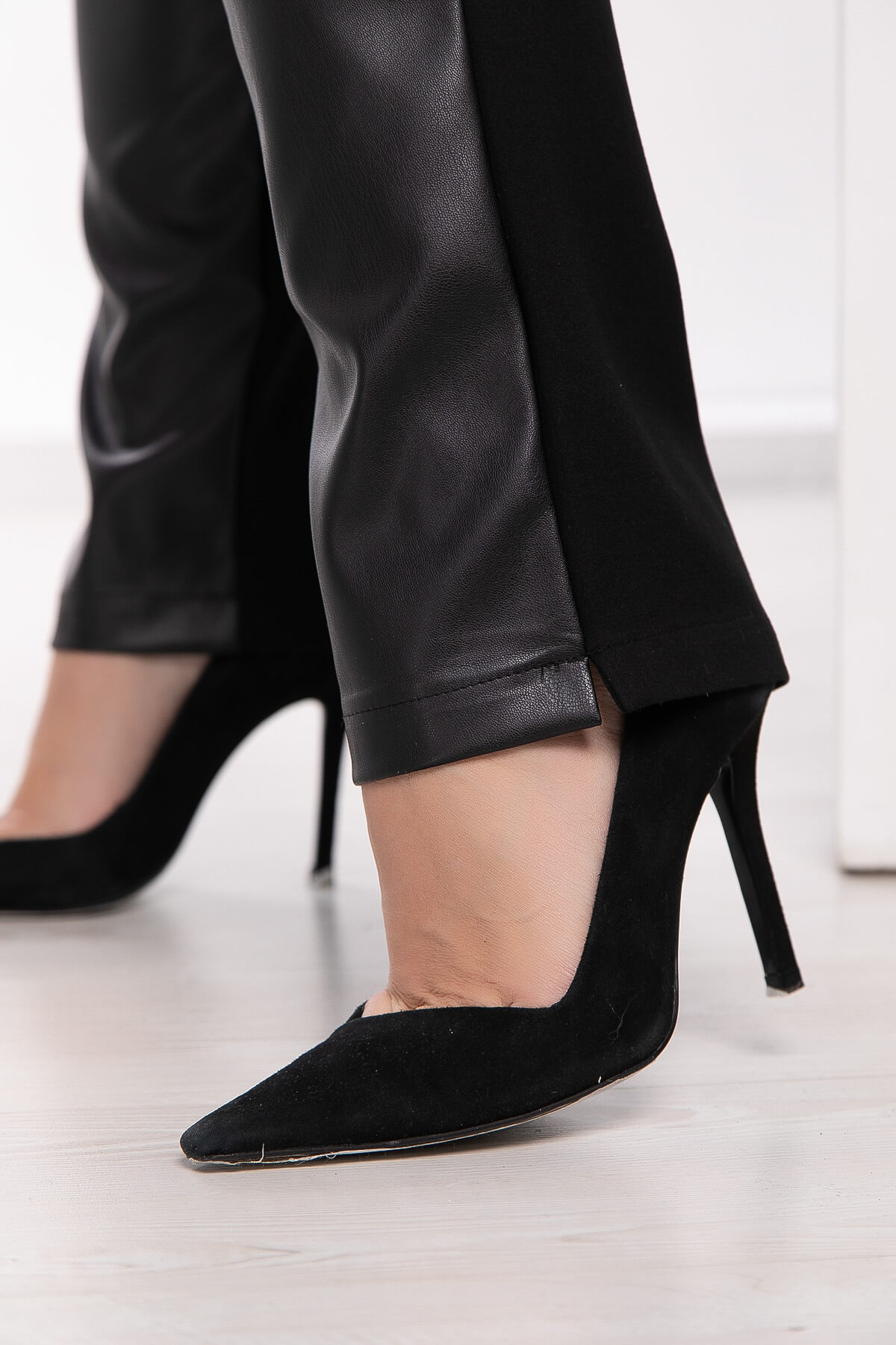 Брюки из комбинированной ткани для создания дерзкого повседневного образа. Брюки с имитацией гульфика, по талии по спинке на резинке. изделие имеет имитацию карматов спереди. Перед выполнен из экокожи. Изделие на завязках, которые позволяют регулировать обхват талии.
