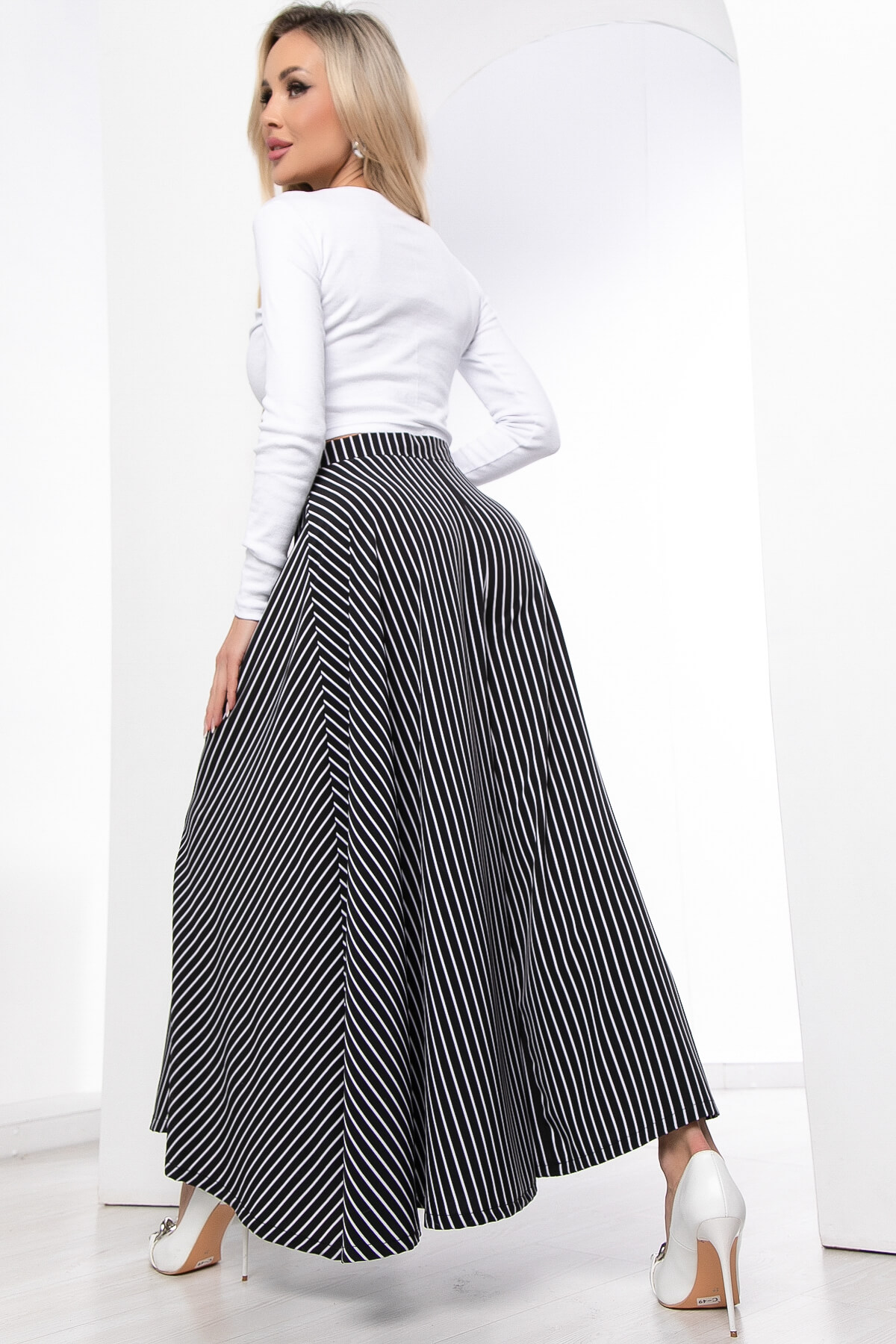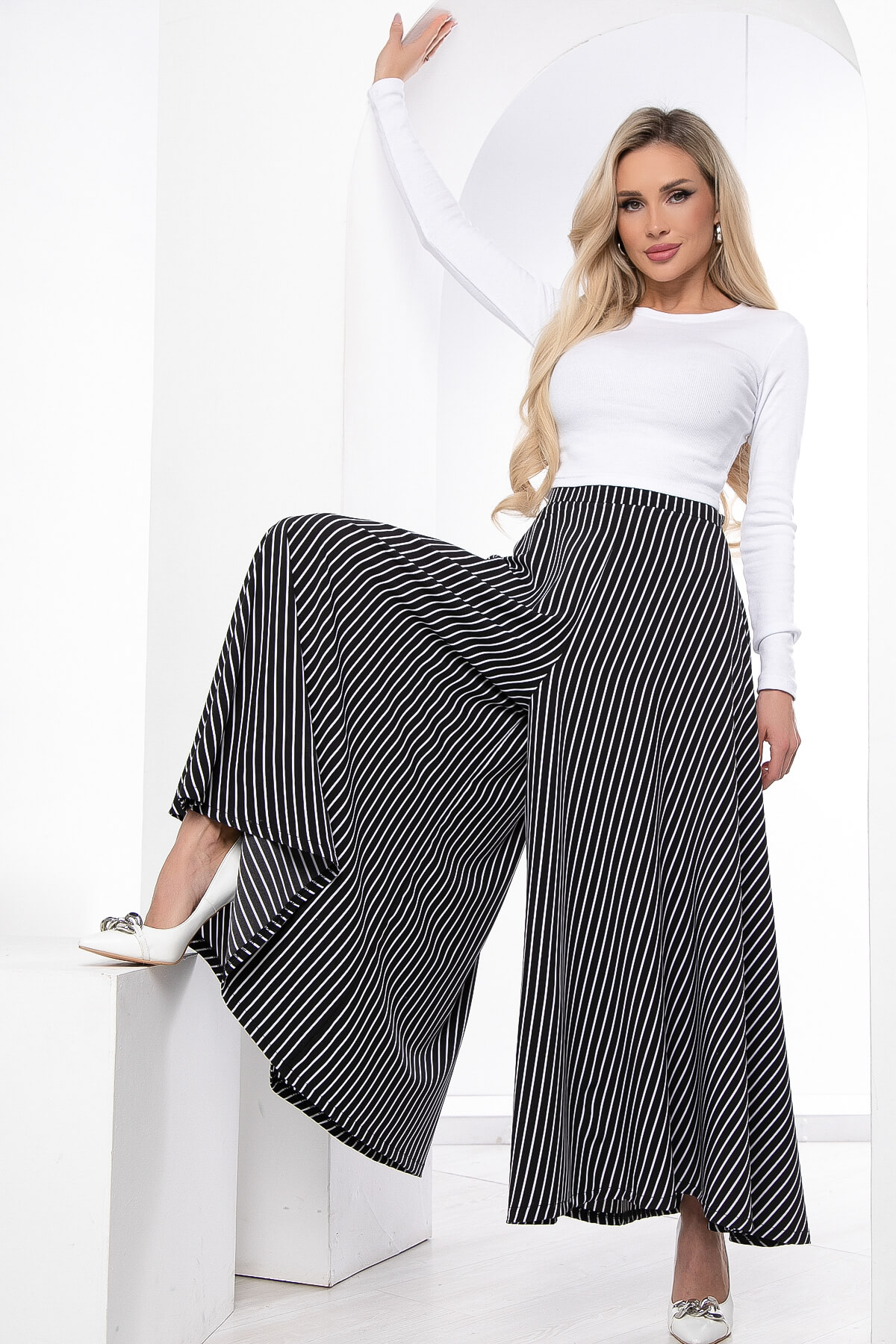 Оригинальные и стильные юбка-брюки в полоску для эффектного появления. Такая модель брюк идеальна для женщин любого возраста. Струящаяся ткань брюк визуально вытягивают и стройнят фигуру. Также брюки-юбка в сочетании с блузой, топом или водолазкой подойдут для повседневной носки и прогулок, а если надеть под них обувь на каблуке, то брюки превращаются в неотъемлемую часть вечернего образа. Талия на притачном поясе. Брюки оснащены потайной молнией по боковому шву.