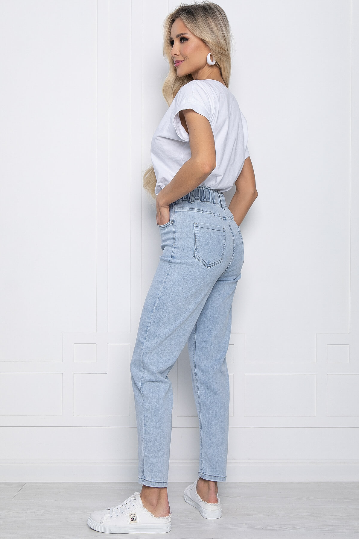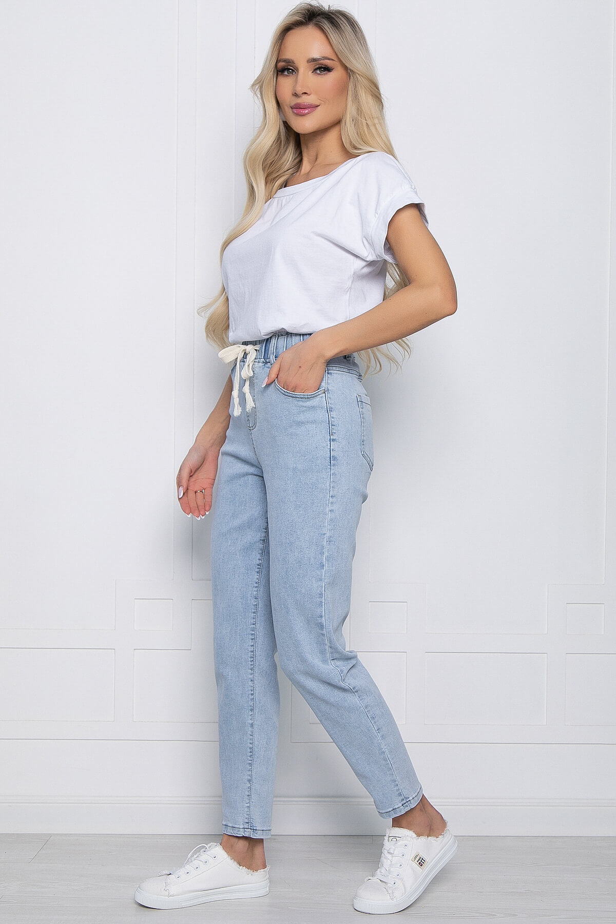 Прямые голубые джинсы сочетаются практически с любыми «верхами»: рубашками, футболками, джемперами, худи, пиджаками. Есть карманы в боковых швах и на задней части изделия. Талия на резинке, дополнена акцентной шнуровкой.