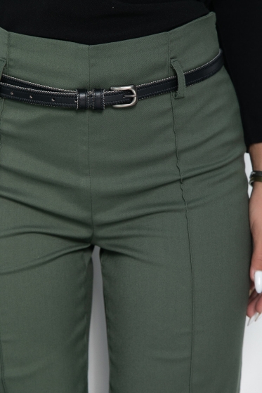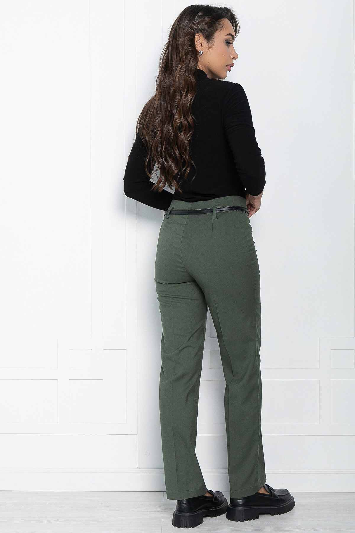 Классические брюки в оттенке хаки, по переду изделия имеются стрелки, что визуально правильно вытянет силуэт и сделает фигуру стройнее. Сбоку потайная молния. Вариант для офисных будней в классических образах. Так же актуально будет смотреться с водолазкой или свитеров в повседневных вариантах. Ремень чёрный из экокожи в комплекте.