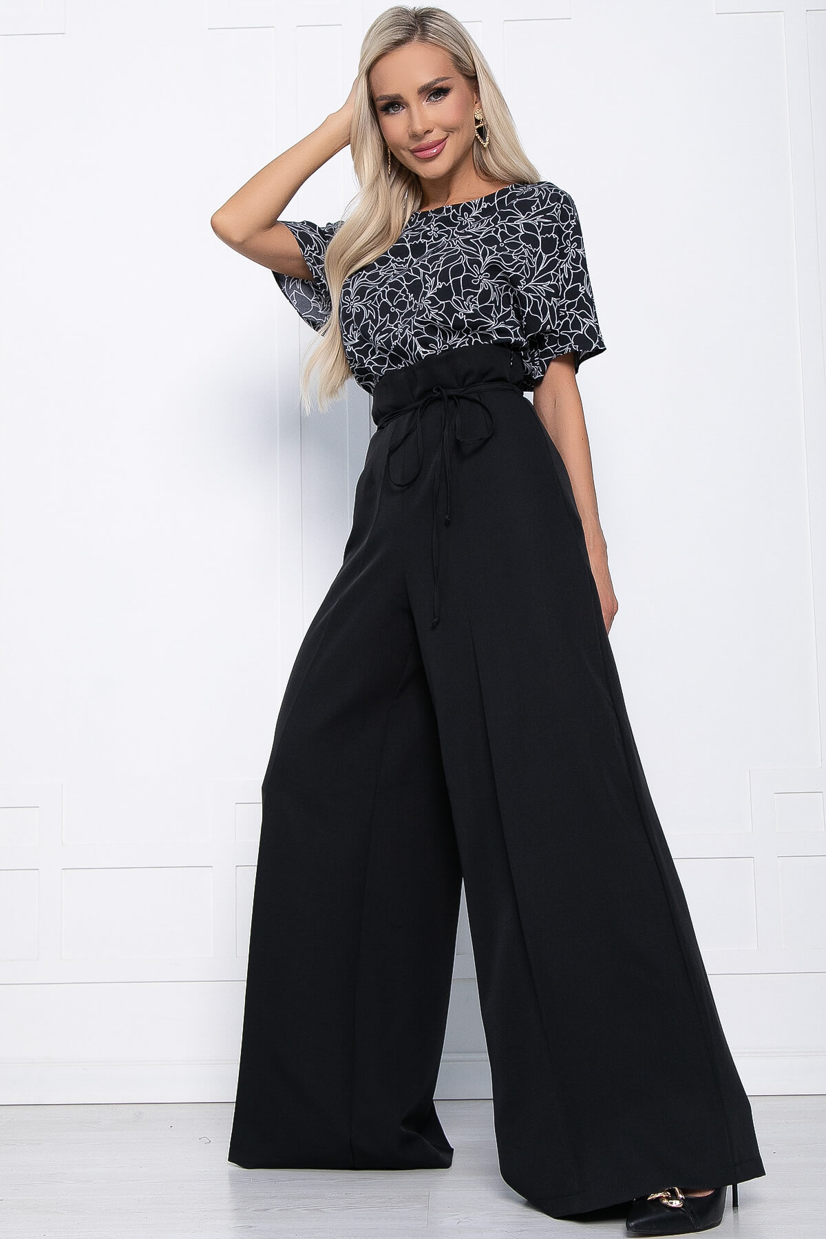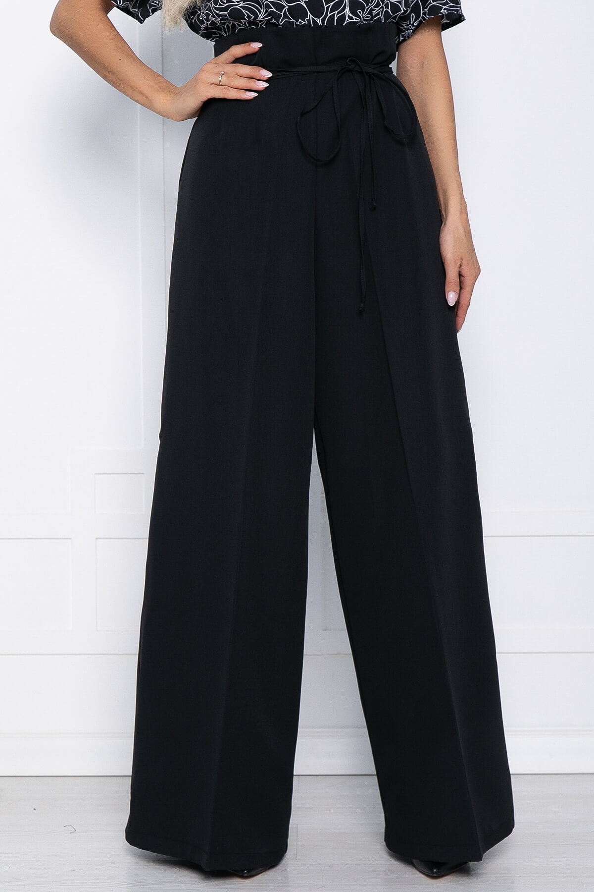 Широкие брюки палаццо А-силуэта с обработанной обтачкой и с застежкой на потайную тесьму-молнию в боковом шве. Брюки имеют плотное прилегание по талии и усиленное расширение от бедра к низу. На передних и задних половинках брюк расположено по 2 вытачки с отделочными строками. Шикарная модель, которая комбинирует в себе классические брюки и одновременно современные и стильные штаны с сексуальной шнуровкой на талии — все зависит от подобранного верха.