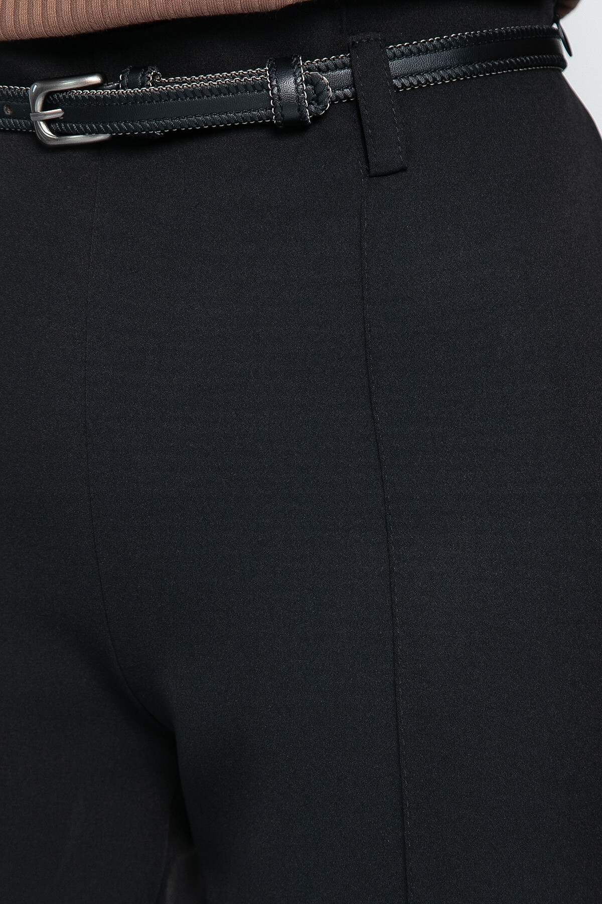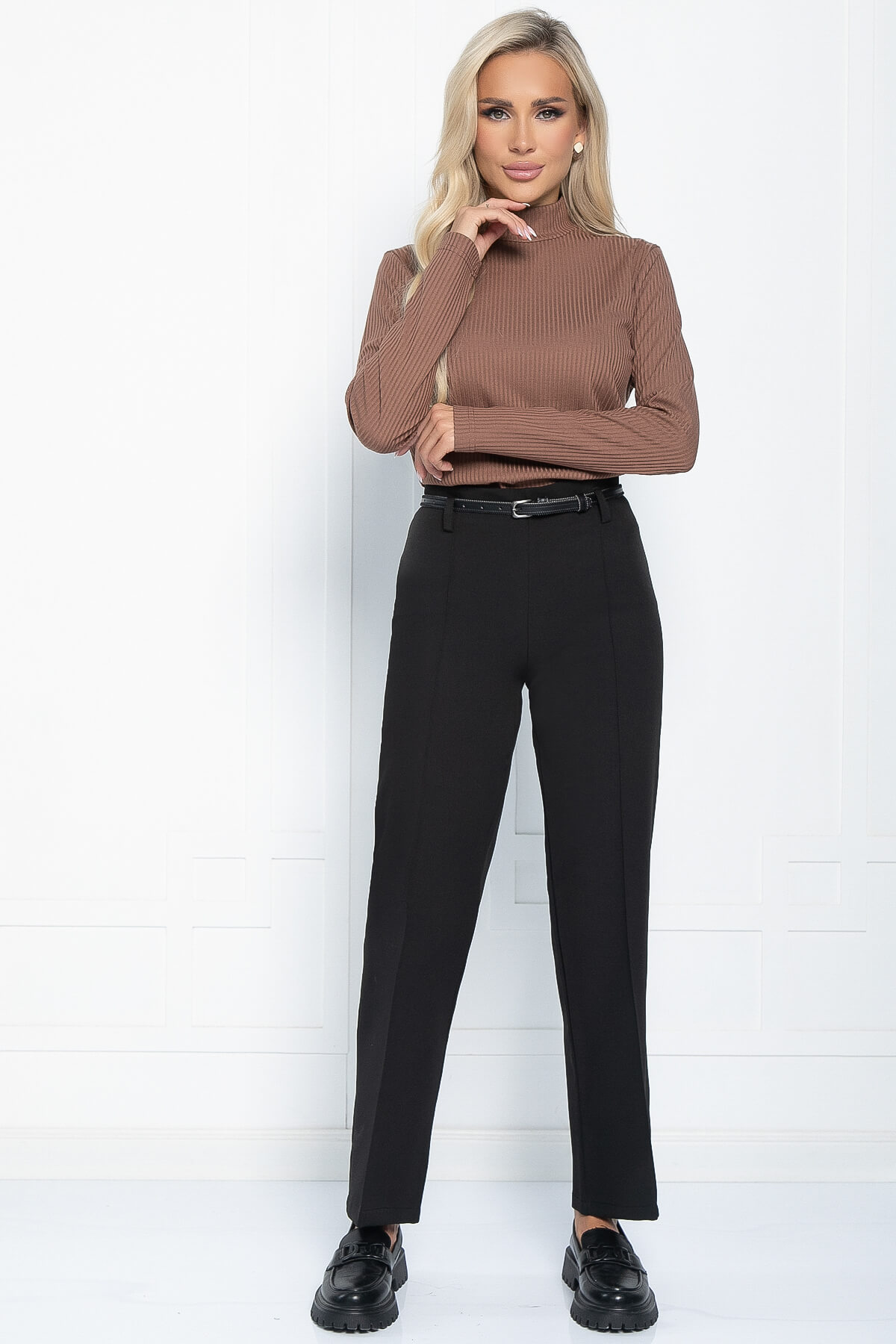 Классические чёрные брюки, по переду изделия имеются стрелки, что визуально правильно вытянет силуэт и сделает фигуру стройнее. Сбоку потайная молния. Вариант для офисных будней в классических образах. Так же актуально будет смотреться с водолазкой или свитеров в повседневных вариантах. Ремень чёрный из экокожи в комплекте.