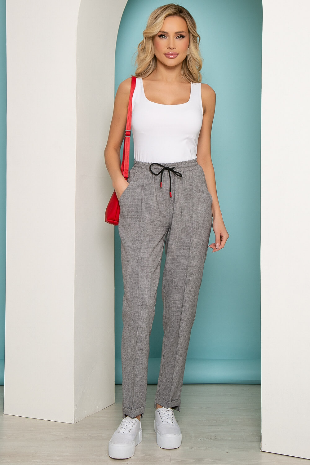 Удобные, но при этом стильные брюки прекрасно дополнят Вашу офисную капсулу. Брюки на резинке, регулируются кулиской, что добавляет комфорта при носке и дает идеальную посадку на любой фигуре. Базовые брюки в светло-сером оттенке. Отстроченные стрелки по переду визуально вытягивают ножку. Низ брюк ассиметричный. В боковых швах карманы, имитация кармашка сзади.