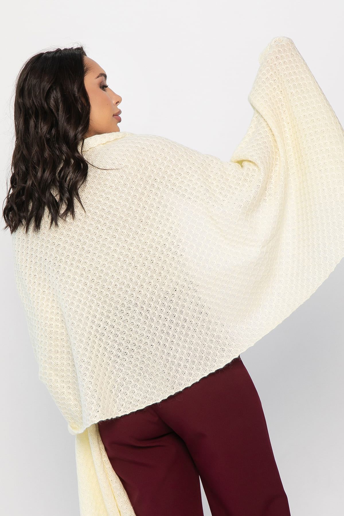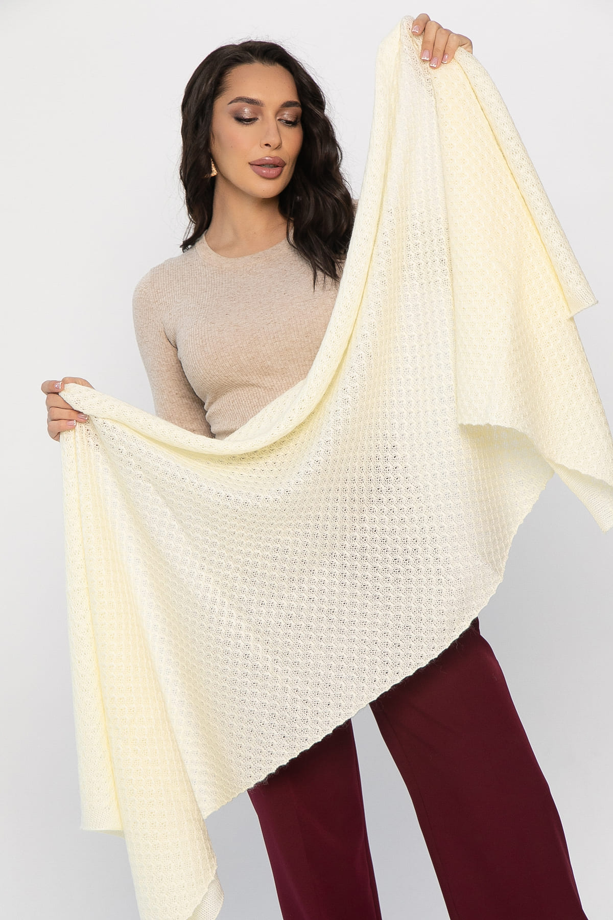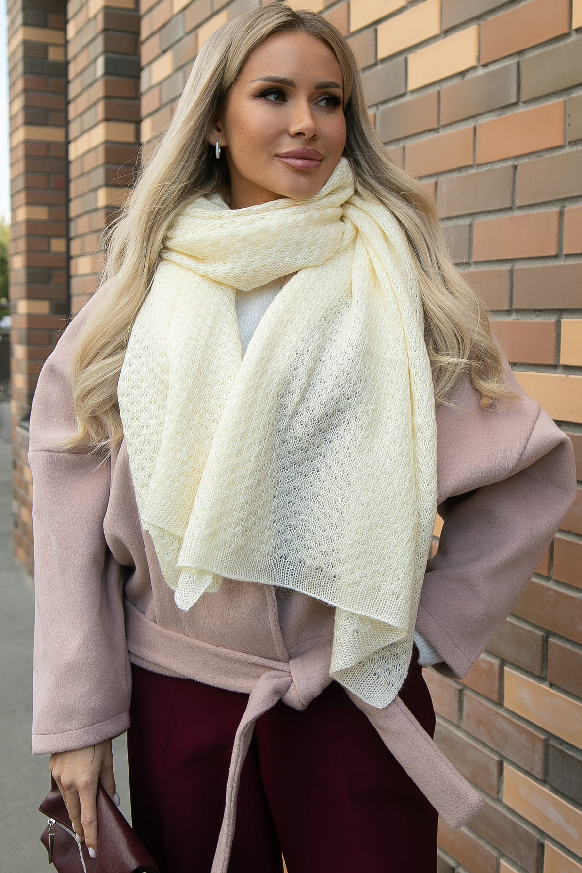 Стильный аксессуар, способный вдохнуть новую жизнь в ваш осенне-зимний гардероб. Вязаный материал обеспечит комфорт и уют в прохладную погоду, а нежный молочный оттенок гармонично впишется практически в любой образ. Палантин можно носить на шее, на голове или как накидку. Создавайте уникальные комбинации, экспериментируйте с образом и наслаждайтесь теплом и стилем!