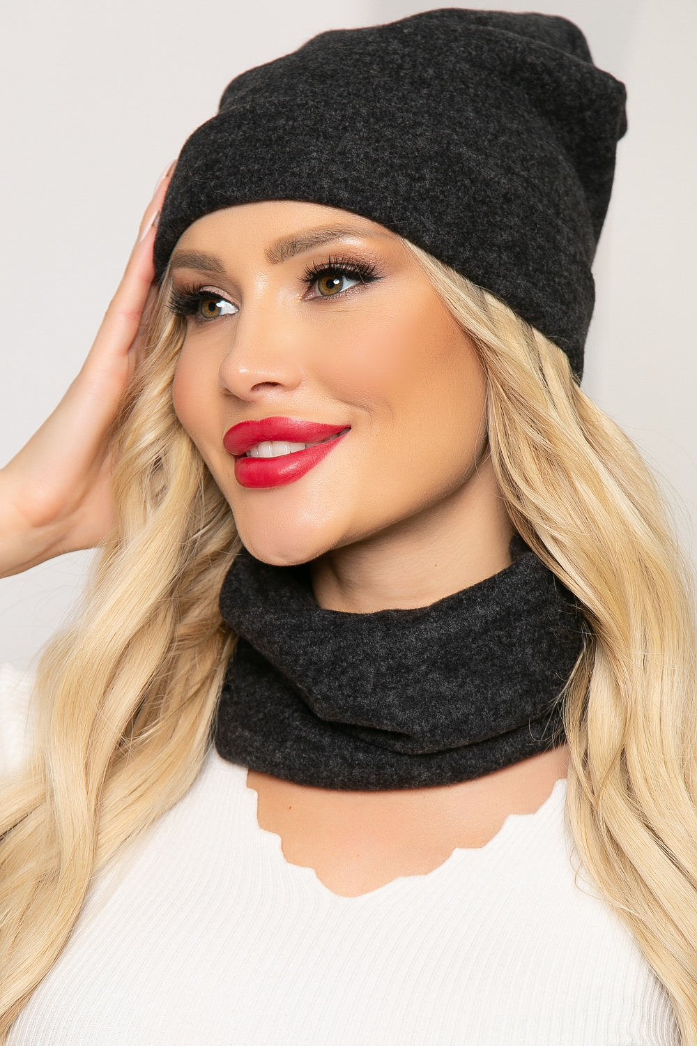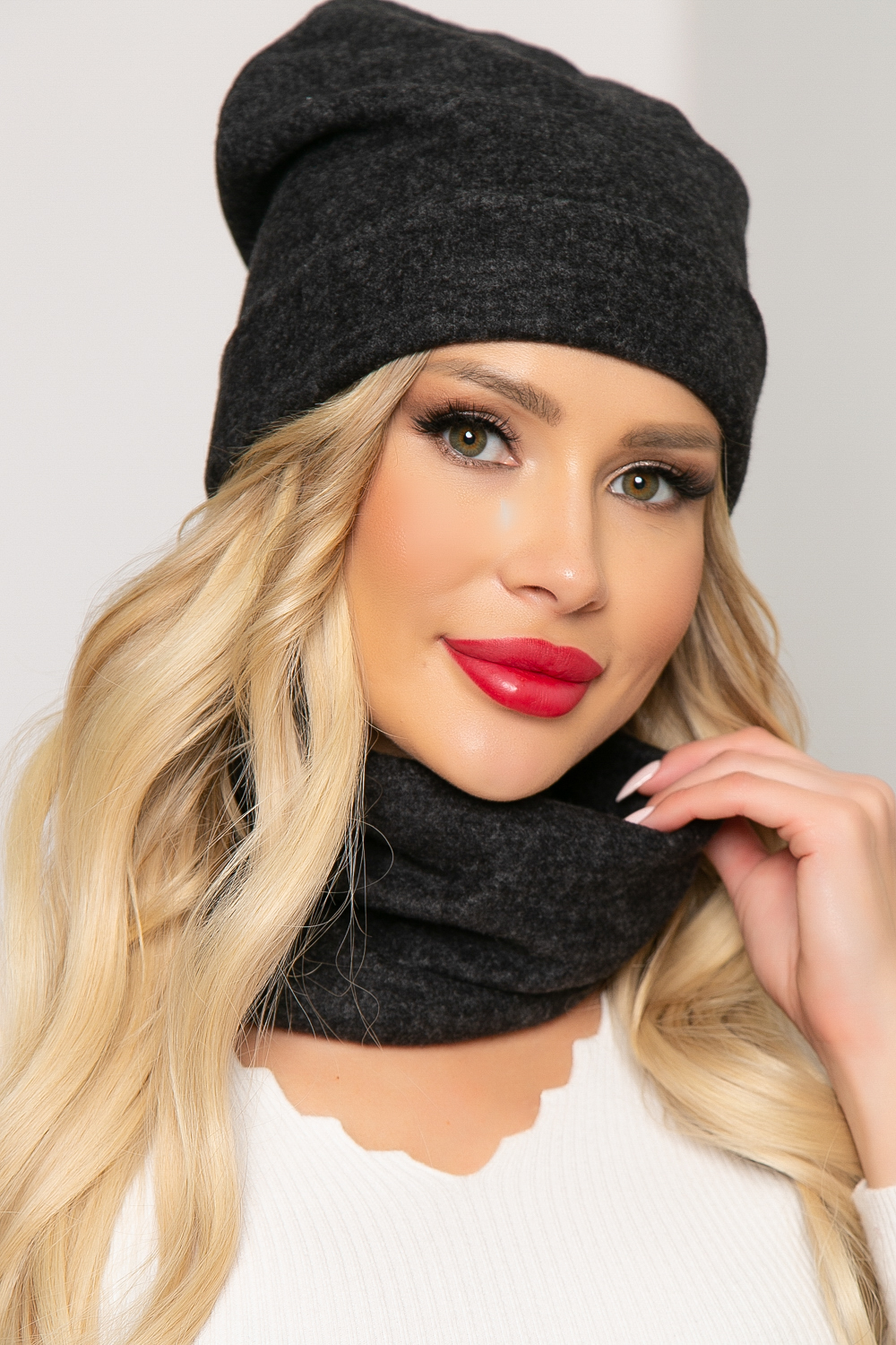Стильная шапка из мягкой ангоры согреет Вас в прохладную пору. Шапка имеет универсальную форму и подходит для любой формы лица. Можно носить с отгибкой и без. Однослойный снуд позволит защитить шею от ветра.