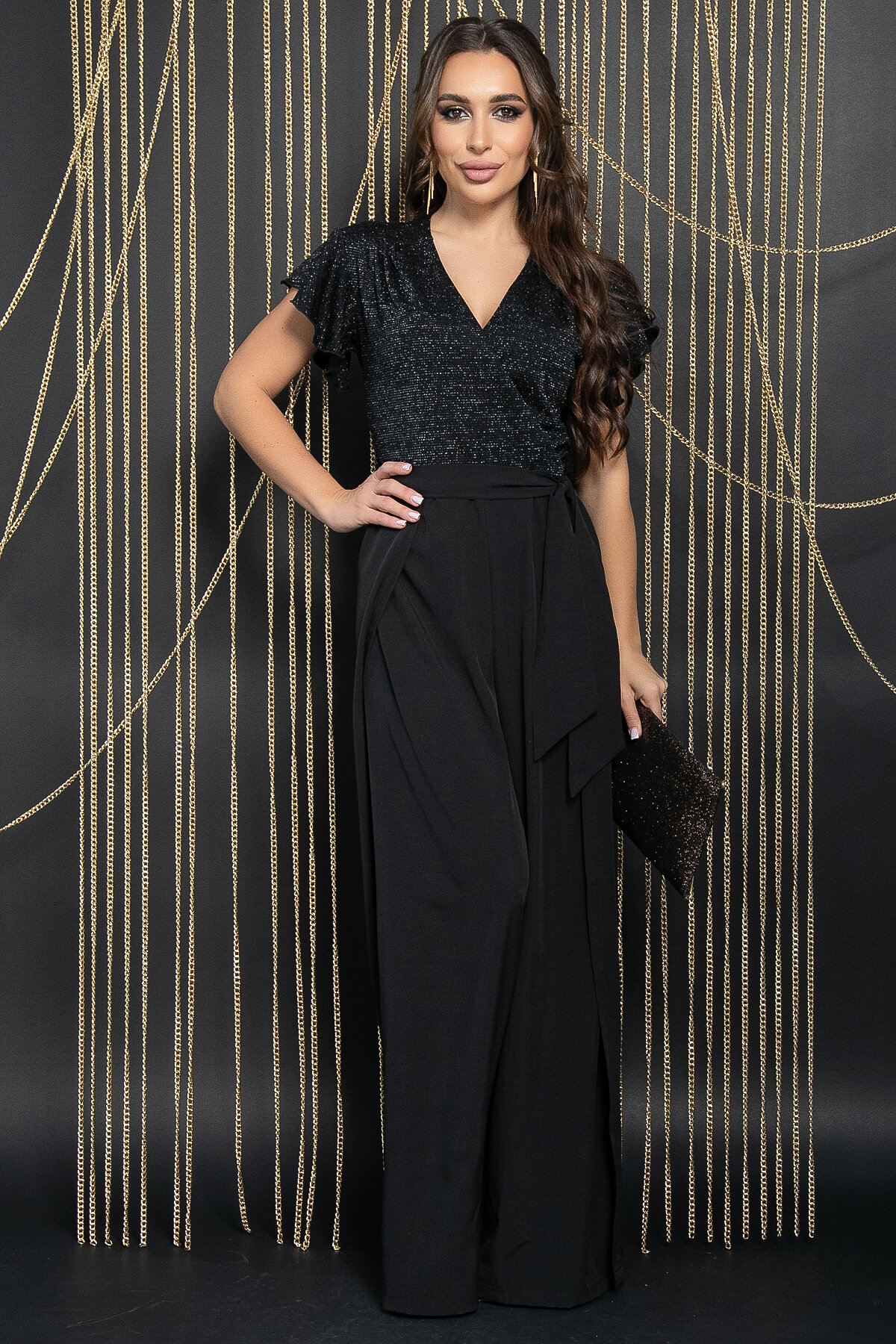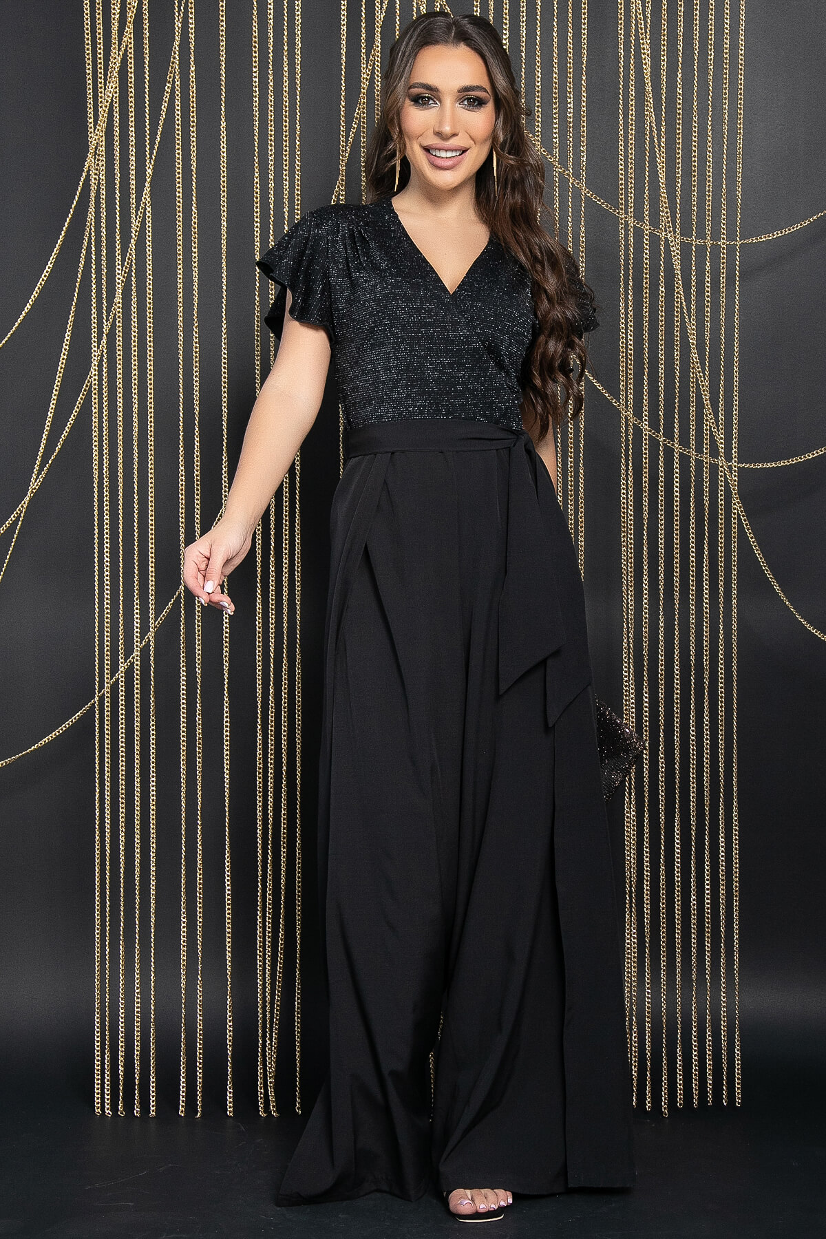 Рост модели: 167 см.Роскошный комбинезон с широкими брюками на запах. В таком наряде можно появиться один раз в свете и остаться в памяти навсегда! Легкая драпировка в области груди добавляет немного объема, а пояс эффектно подчеркивает талию, обеспечивая образу утонченный стиль. По спинке застежка на потайную молнию. В таком комбинезоне вы будете неотразимой и чувственной.