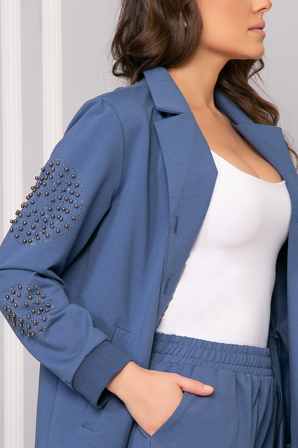 Костюм-двойка, состоящий из брюк и жакета. Брюки по талии на резинке, слегка заужены книзу. Жакет по переду застёгивается на пуговицы, рукава украшены серебристыми бусинами с надёжными креплениями. Такой костюм может быть быть использован для создания повседневного или делового образа.