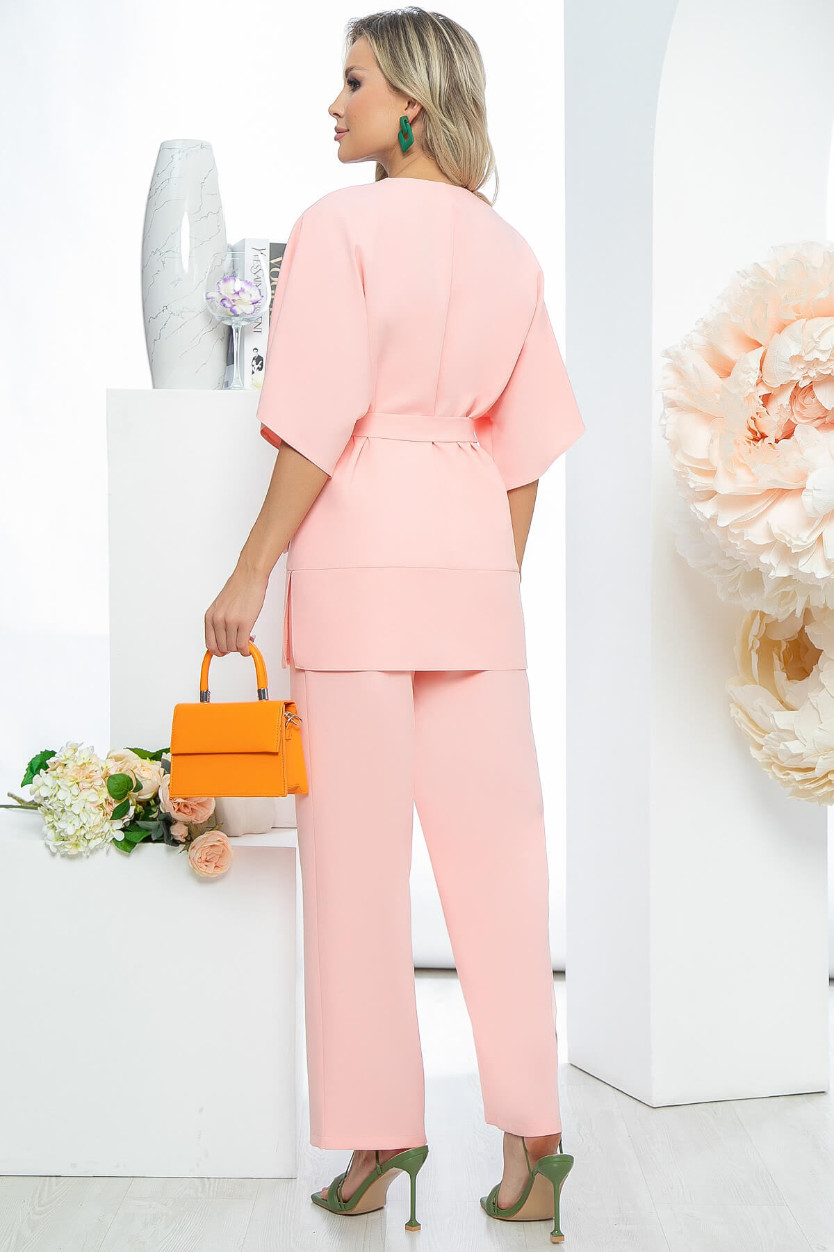 Костюм-двойка, состоящий из брюк прямого кроя и жакета. Комплект можно носить, подчеркнув талию поясом из основной ткани или же без него. В обоих вариантах образ будет смотреться красиво. Рукав широкий, свободного кроя добавит образу воздушности. Брюки по талии на резинке. Жакет прямого кроя, по бокам есть разрезы. Пояс из основной ткани входит в комплект.