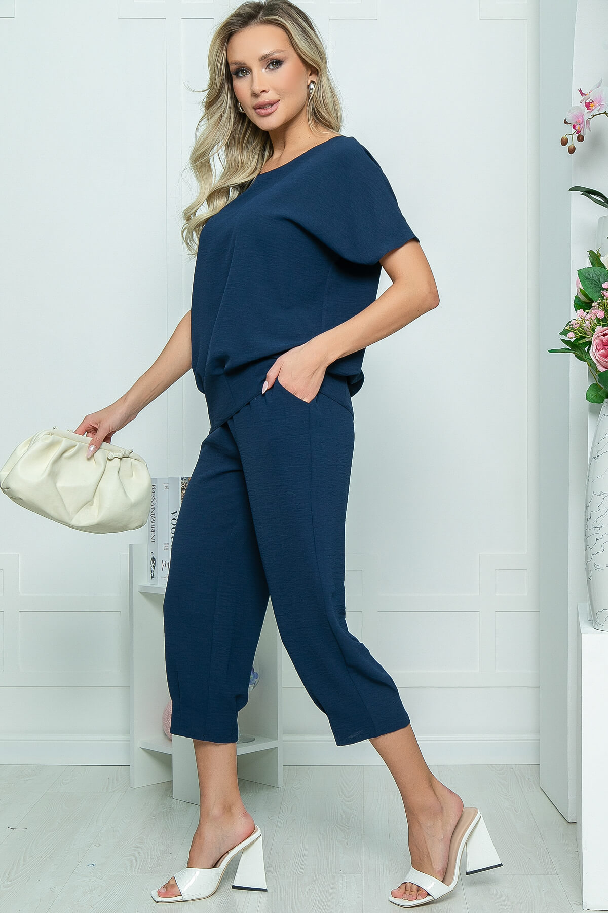 Костюм из лёгкой ткани, состоящий из свободной блузы и укороченных брюк. Комплект удобен тем, что даёт возможность миксовать вещи, создавая множество стильных образов каждый день!