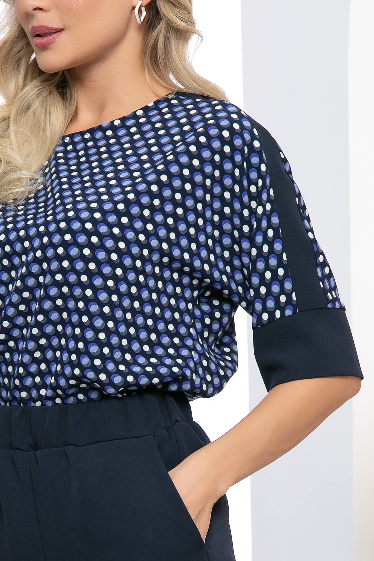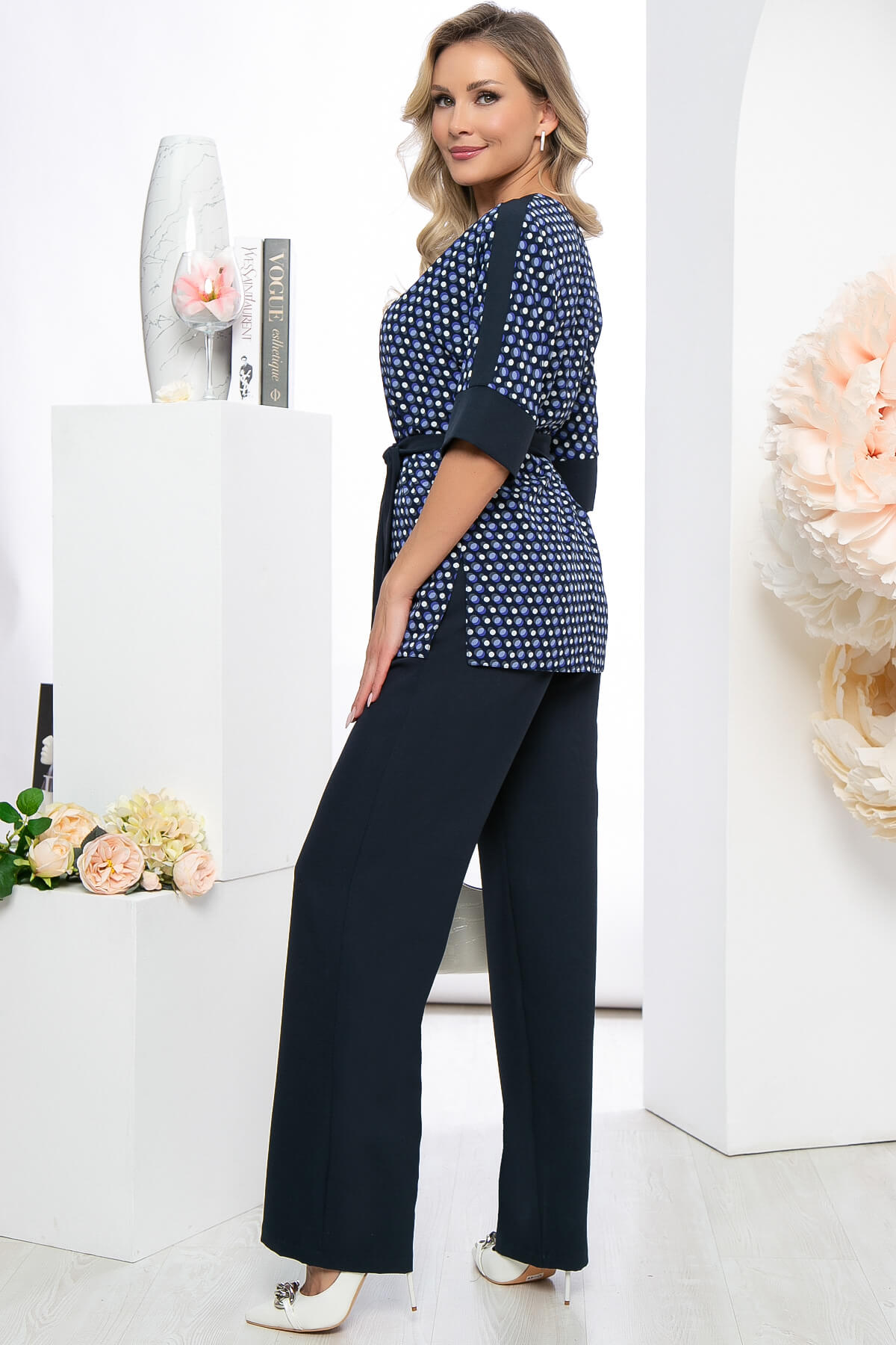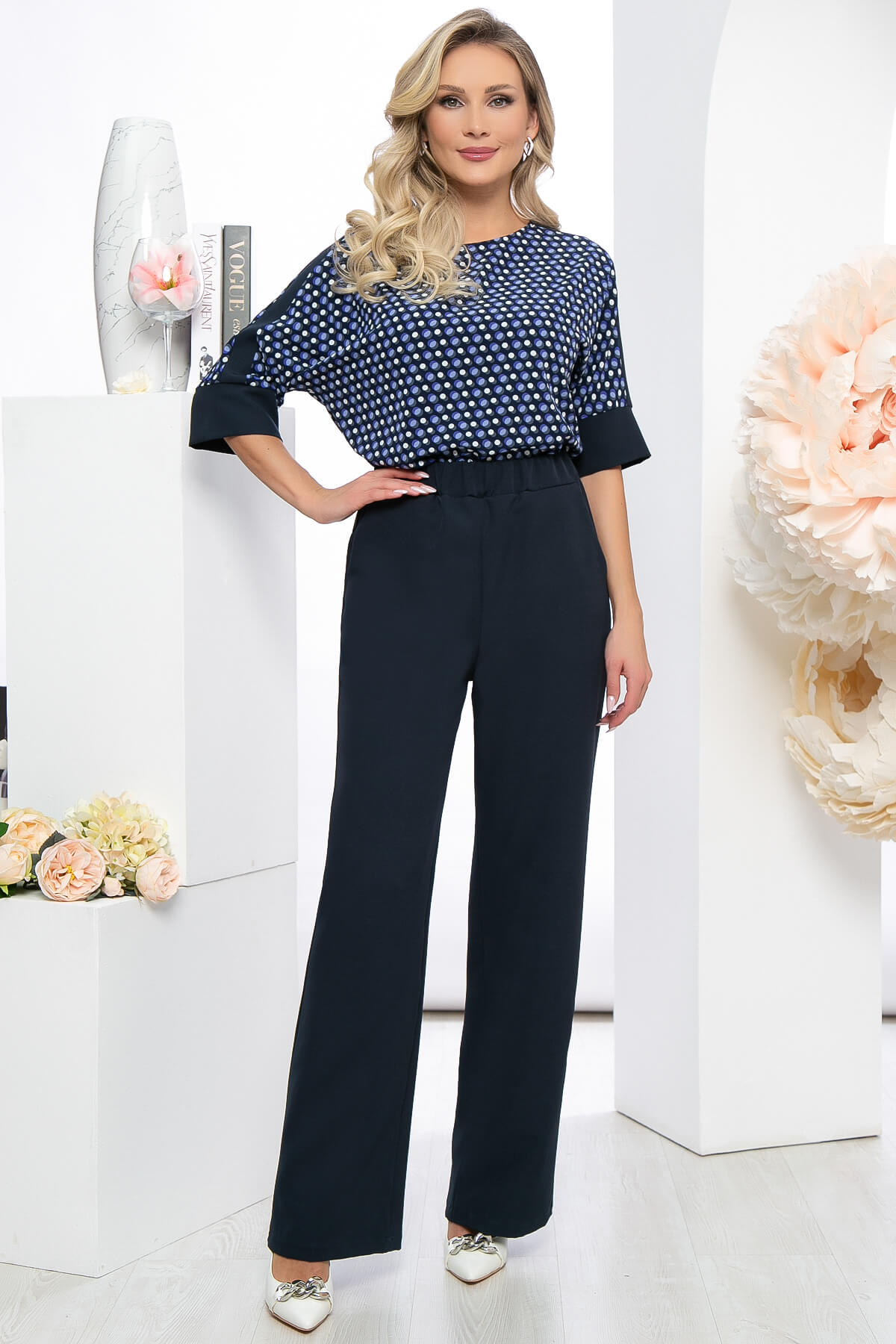 Костюм-двойка, состоящий из классических брюк прямого кроя и блузы прямого кроя. Данный комплект можно носить, подчеркнув талию поясом из основной ткани или же, заправив блузу. В обоих вариантах костюм будет смотреться интересно. Брюки по талии на резинке, в боковых швах есть карманы. Блуза прямого кроя, по бокам есть разрезы. Пояс из основной ткани входит в комплект.