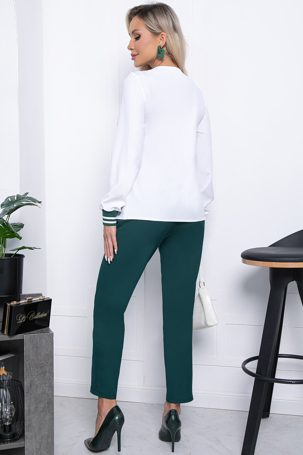 Костюм-двойка, состоящий из зауженных брюк с высокой посадкой на резинке и блузы свободного кроя. Преимущество комплекта в том, что вы сможете самостоятельно носить как блузу, так и брюки. В повседневном образе смело сочетайте с лоферами или ботинками, а если нужен более официальный образ, с туфлями на каблуке.