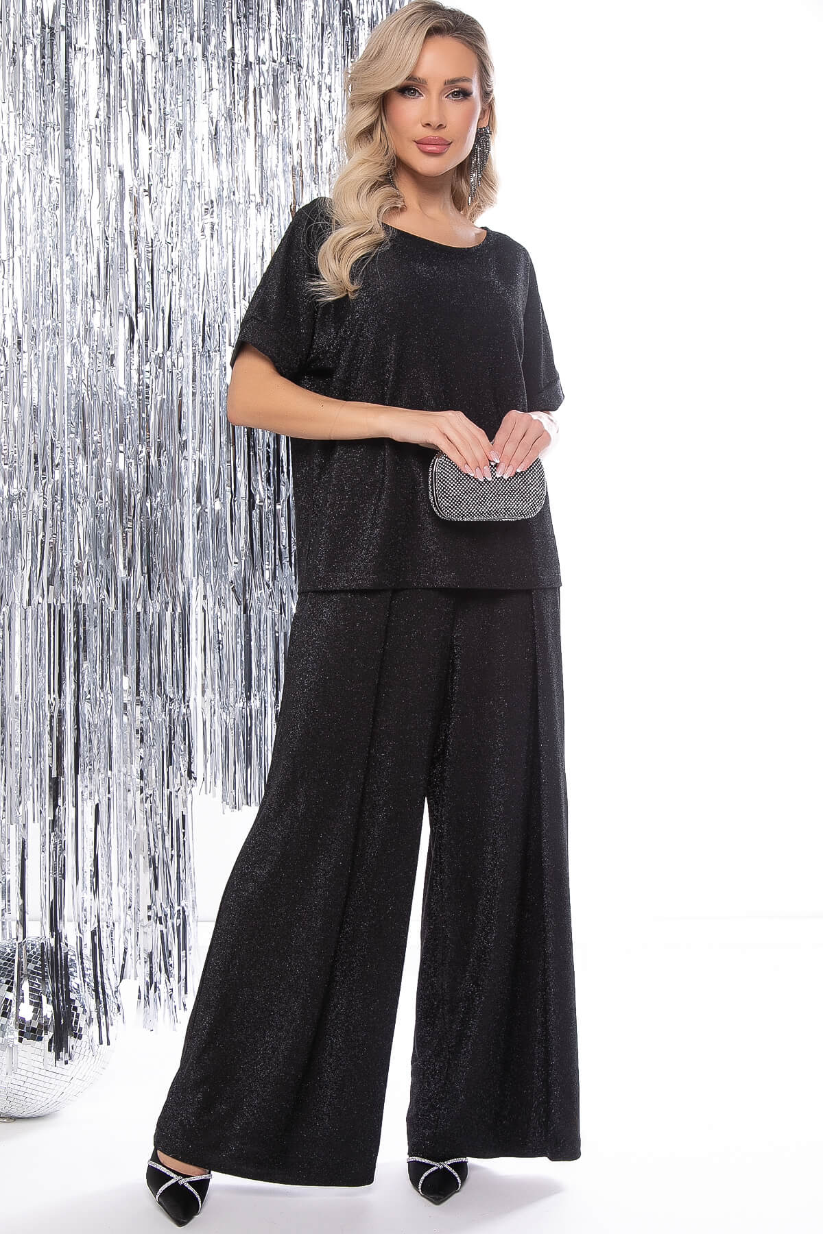 Среди всех модных изделий настоящая модница старается отдать предпочтение наиболее практичной.Такая вещь должна быть и красивой, и удобной, и уместной в самых разных ситуациях. Роскошный легкий костюм с мерцанием - это отличное решение на любой праздник! Шикарные брючки с высокой посадкой не просто идеально смотрятся на фигуре, но и создают полное ощущение комфорта благодаря своему крою и легкости материала.