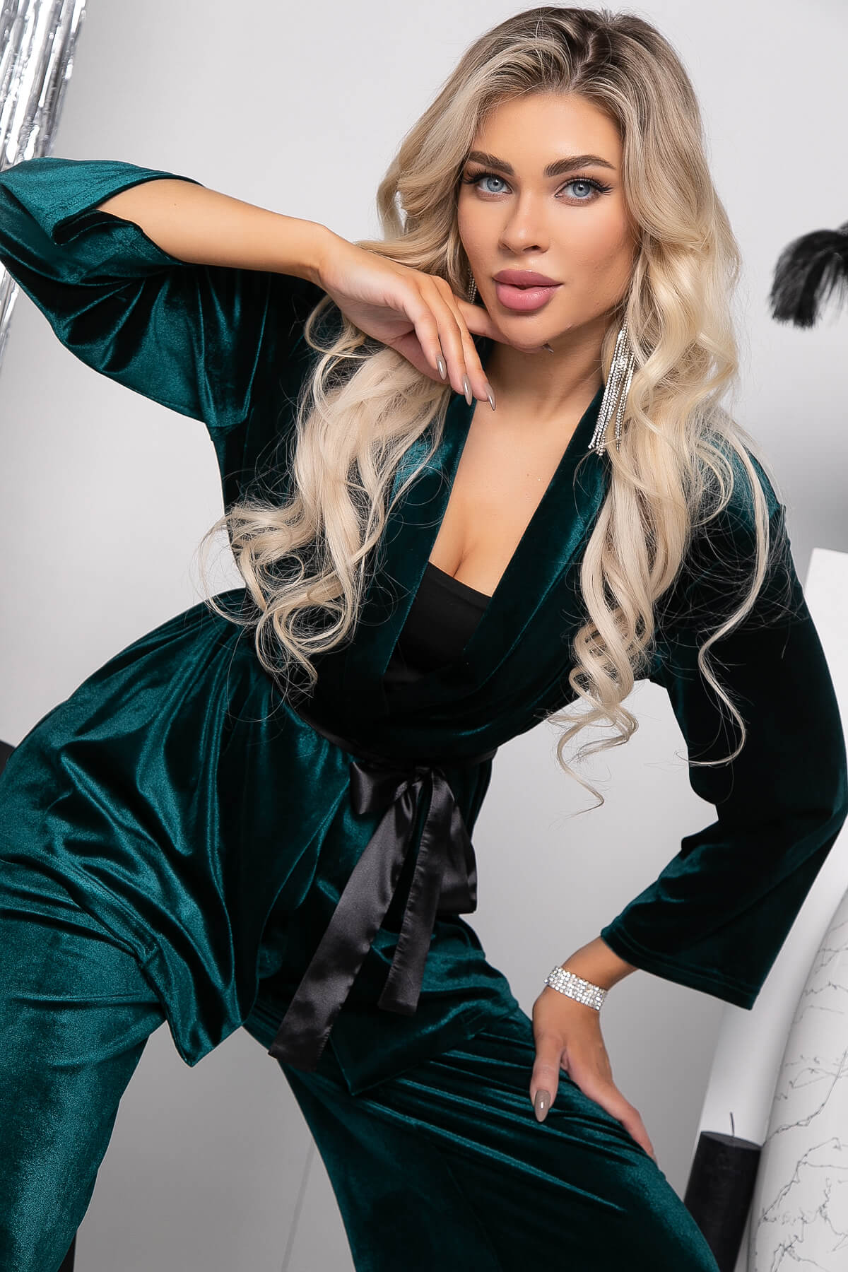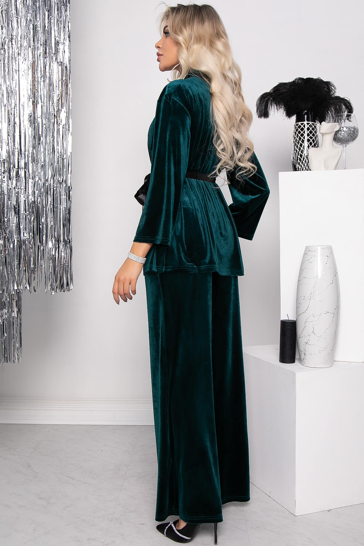 Роскошный бархатный костюм в стильном оттенке. Богемный лоск этой новинки просто сводит с ума! Шикарные брюки с высокой посадкой не просто идеально смотрятся на фигуре, но и создают полное ощущение комфорта благодаря своему крою и мягкости материала. Рукав втачной, три четверти. В комплект входит пояс из атласа.