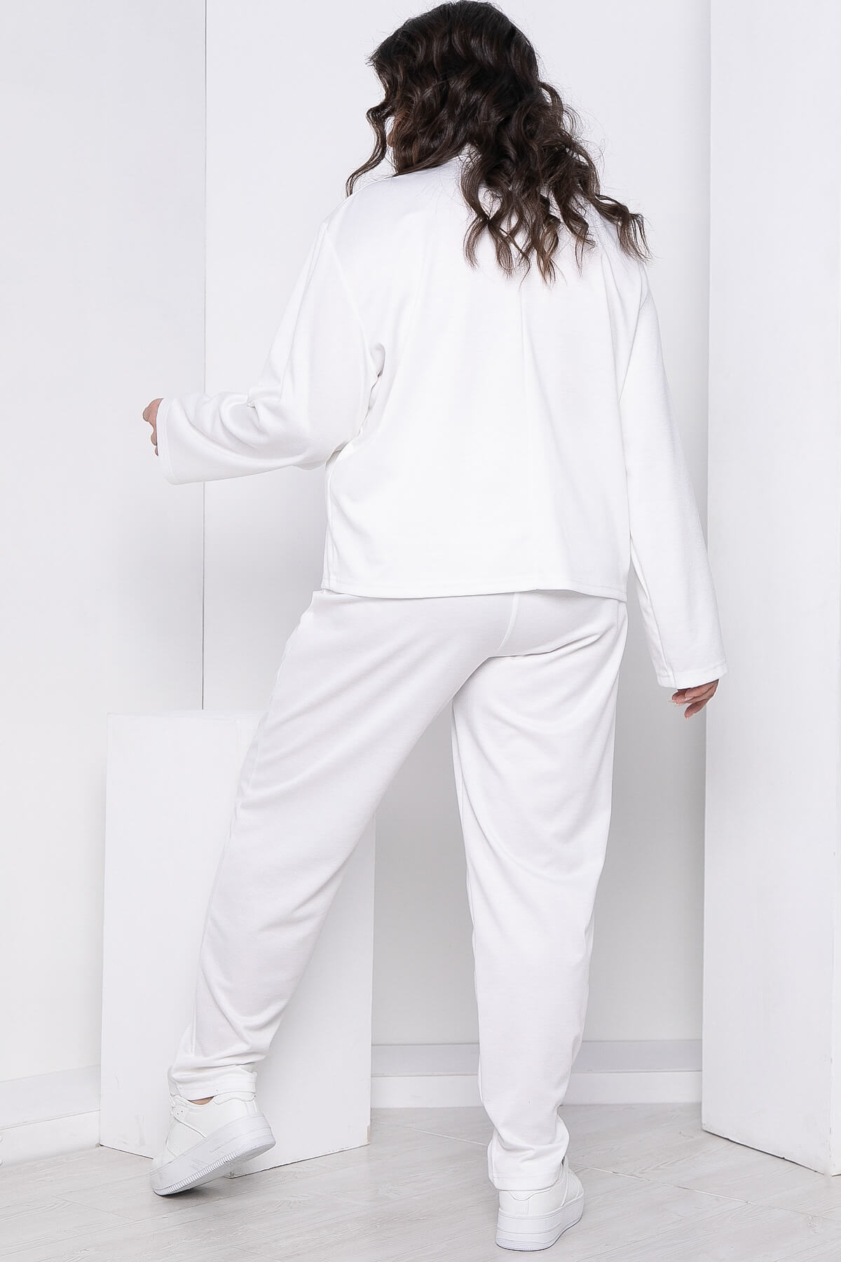 Костюм-двойка, состоящий из классических брюк прямого кроя и свободного джемпера с воротником стойкой на пуговицах. Брюки на резинке, в боковых швах есть карманы. В таком трикотажном костюме можно смело отправиться на прогулку или на встречу с друзьями. Целый день вам будет уютно и комфортно. Пуговицы с легким перламутровым отливом придают оригинальность образу. На брюках отстроченные стрелки.