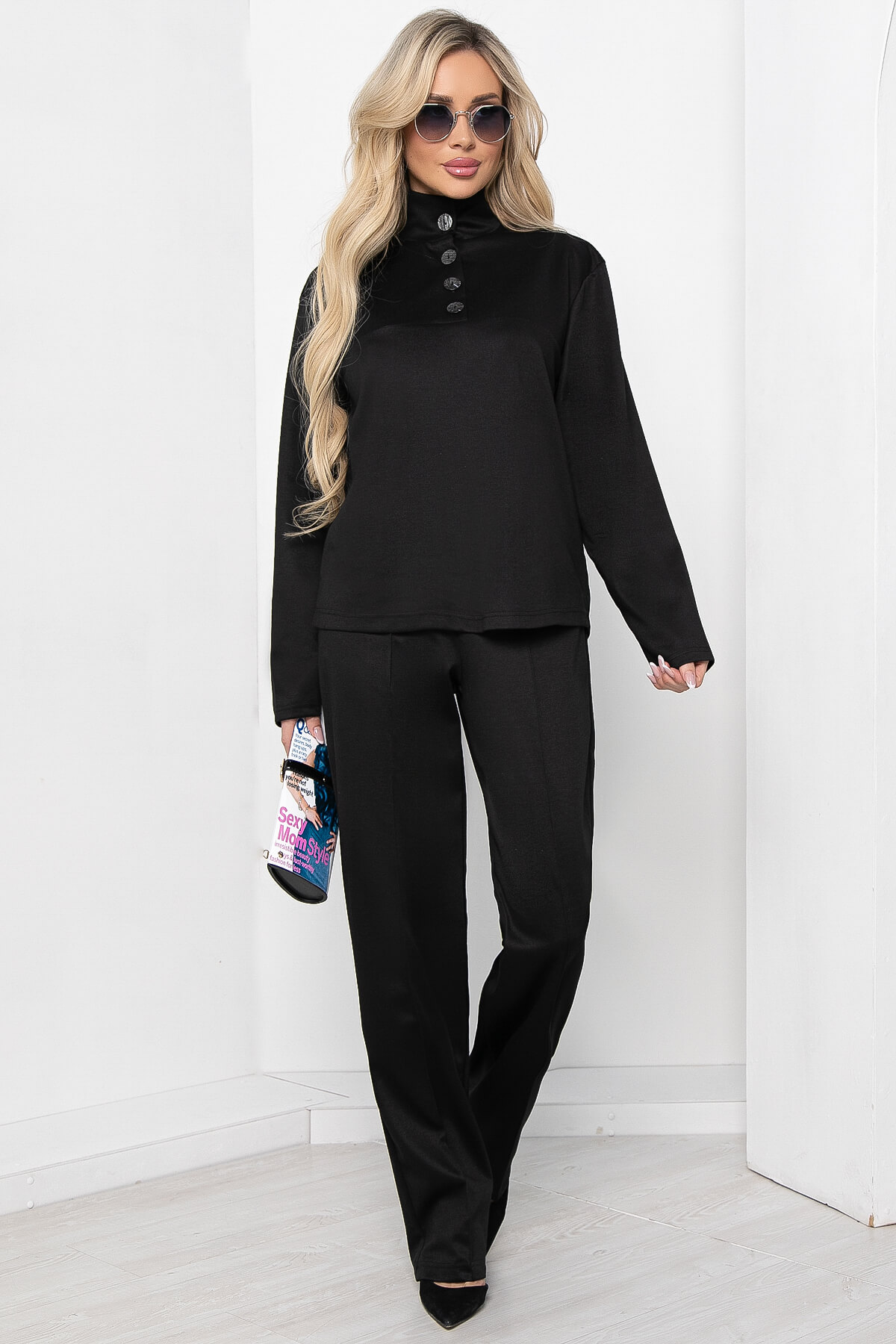 Костюм-двойка, состоящий из классических брюк прямого кроя и свободного джемпера с воротником стойкой на пуговицах. Брюки на резинке, в боковых швах есть карманы. В таком трикотажном костюме можно смело отправиться на прогулку или на встречу с друзьями. Целый день вам будет уютно и комфортно. Пуговицы с легким перламутровым отливом придают оригинальность образу.