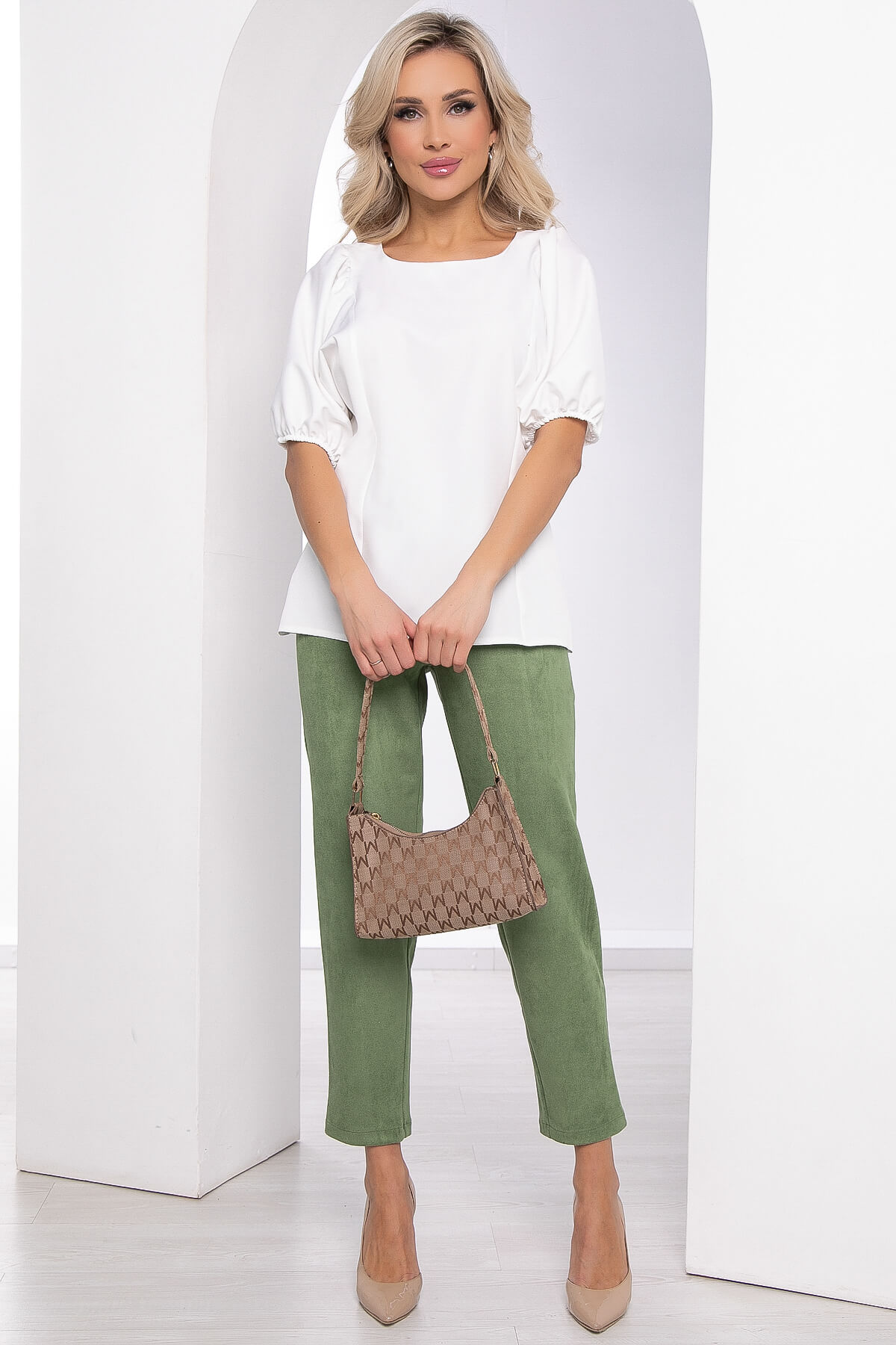 Элегантный костюм, состоящий из брюк с высокой посадкой на резинке и блузы свободного кроя с акцентными рукавами. Очень женственный комплект с весенним сочетанием белого и зеленого цвета.. Округлый вырез горловины, рукав три четверти втачной, по форме напоминает "фонарик".