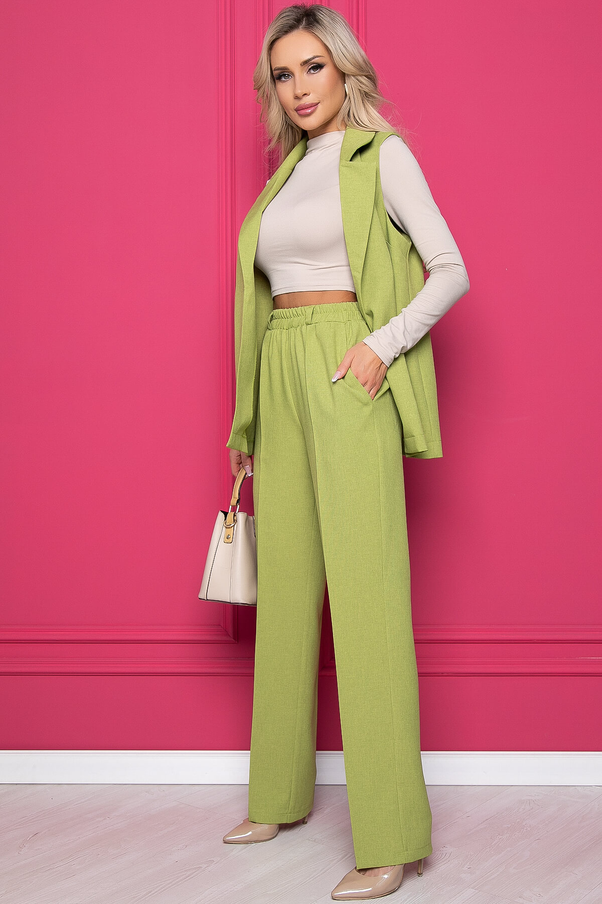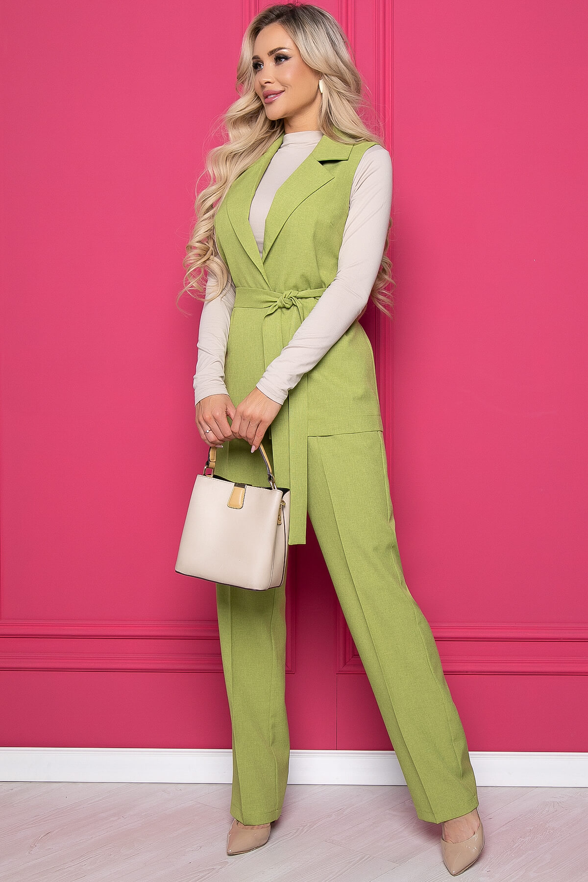 Яркий стильный костюм-двойка, состоящий из классических брюк прямого кроя и жилета. Идеальный выбор для повседневного или делового образа. Дополняйте его акцентными блузами или водолазками, что позволит создать даже праздничный наряд. В комплект входит пояс из основной ткани, который позволит подчеркнуть линию талии.