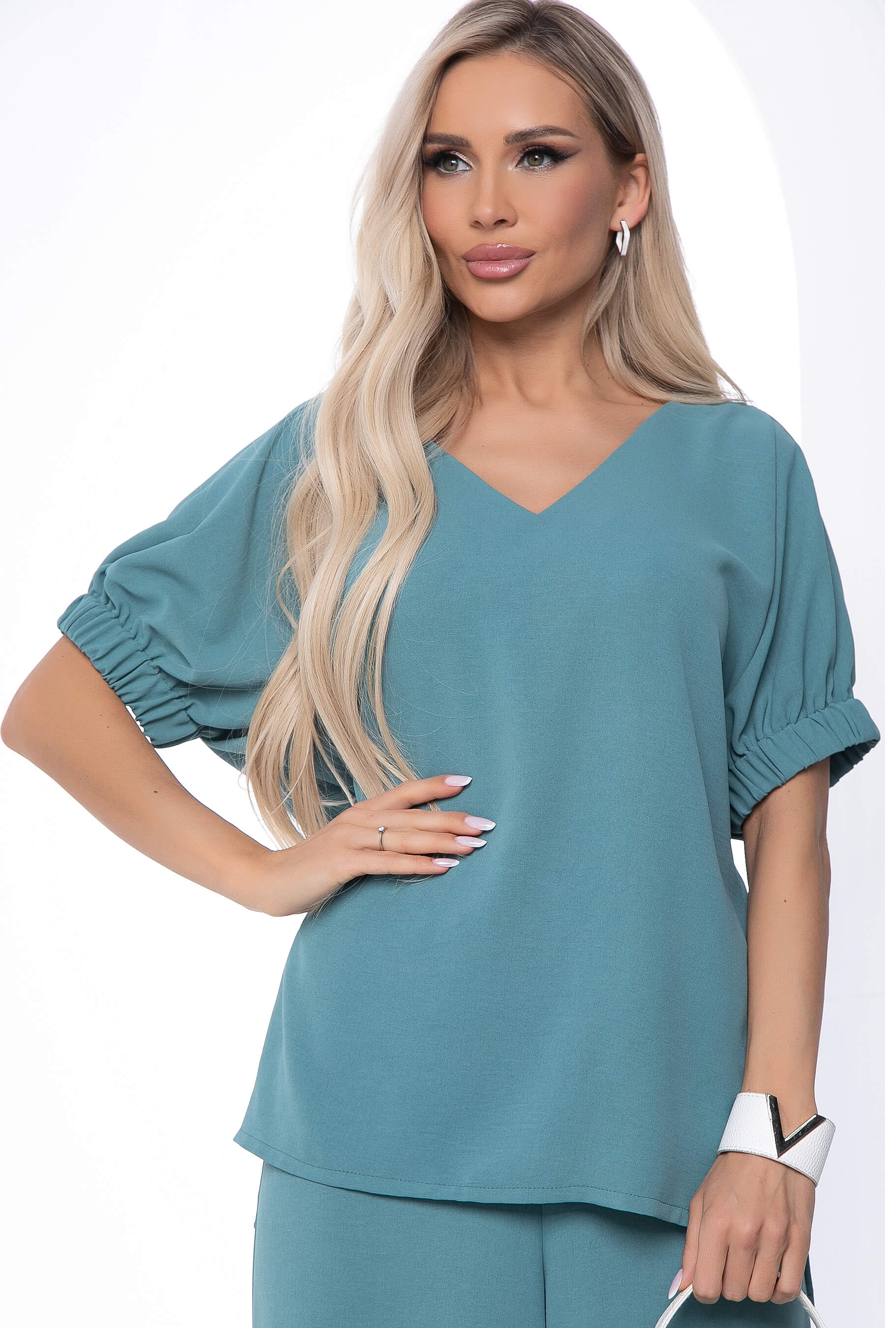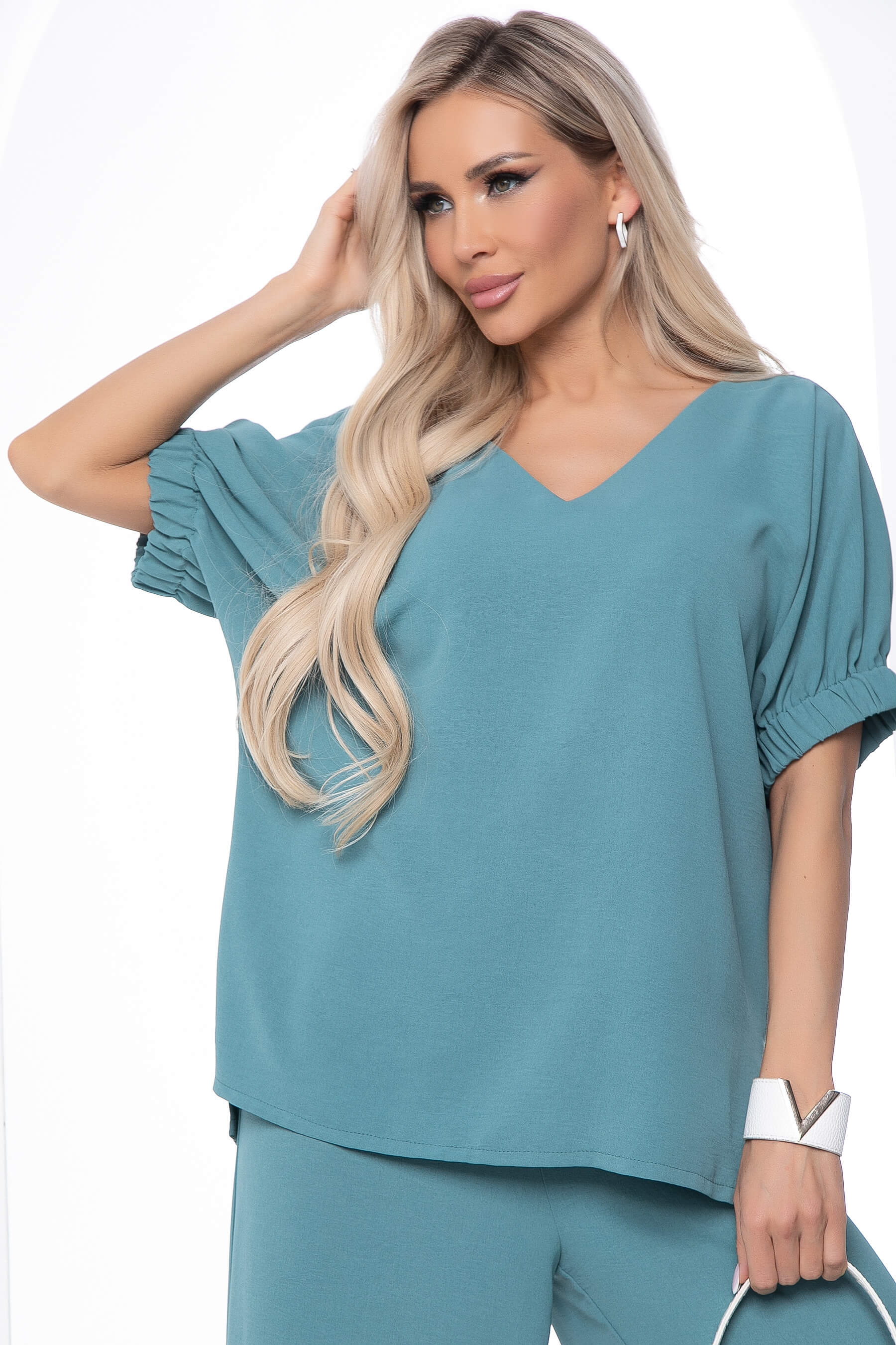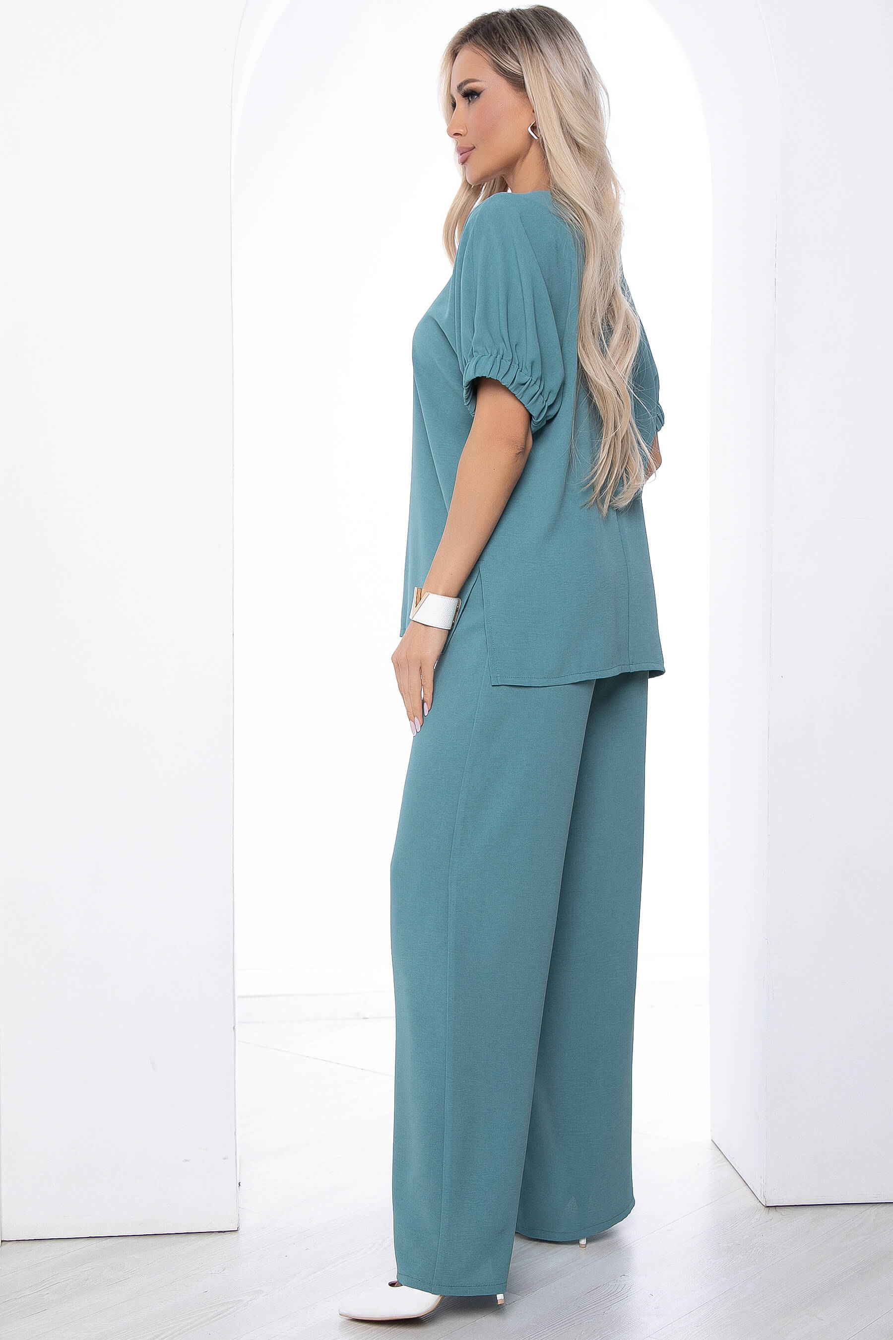 Универсальный, легкий и стильный брючный комплект. Прекрасно подойдет для моря и пляжного отдыха. Блузка свободного силуэта, с цельнокроеными рукавами по низу на резине. По бокам у блузы разрезы, спинка длиннее переда. Брюки свободные прямые на поясе с резиной.