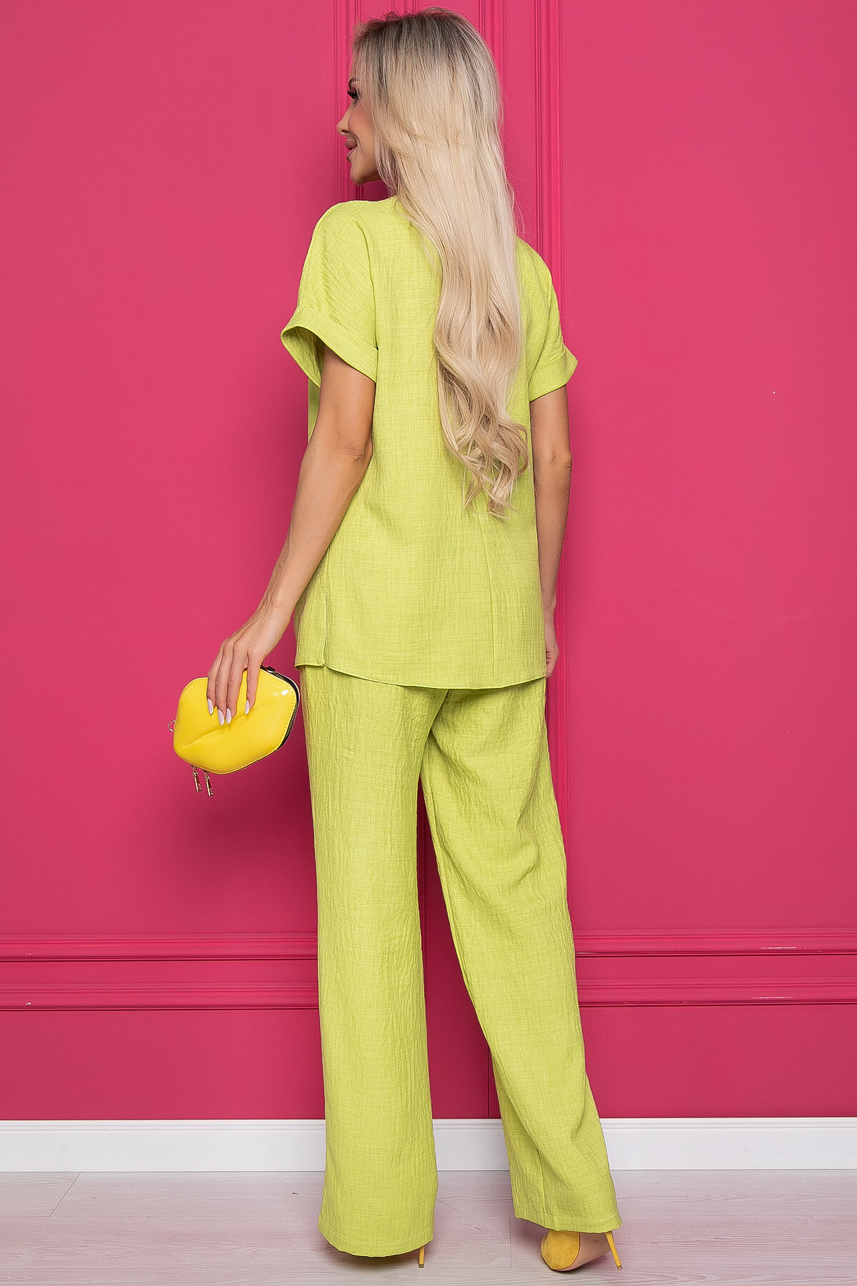 Костюм не сковывает движения, очень удобный и дарит ощущение лёгкости в жаркую погоду. Идеально подходит для создания офисных и повседневных летних прогулок. В комплекте пояс из основной ткани. Костюм без подкладки. Брюки на резинке, присутствуют карманы в боковых швах.