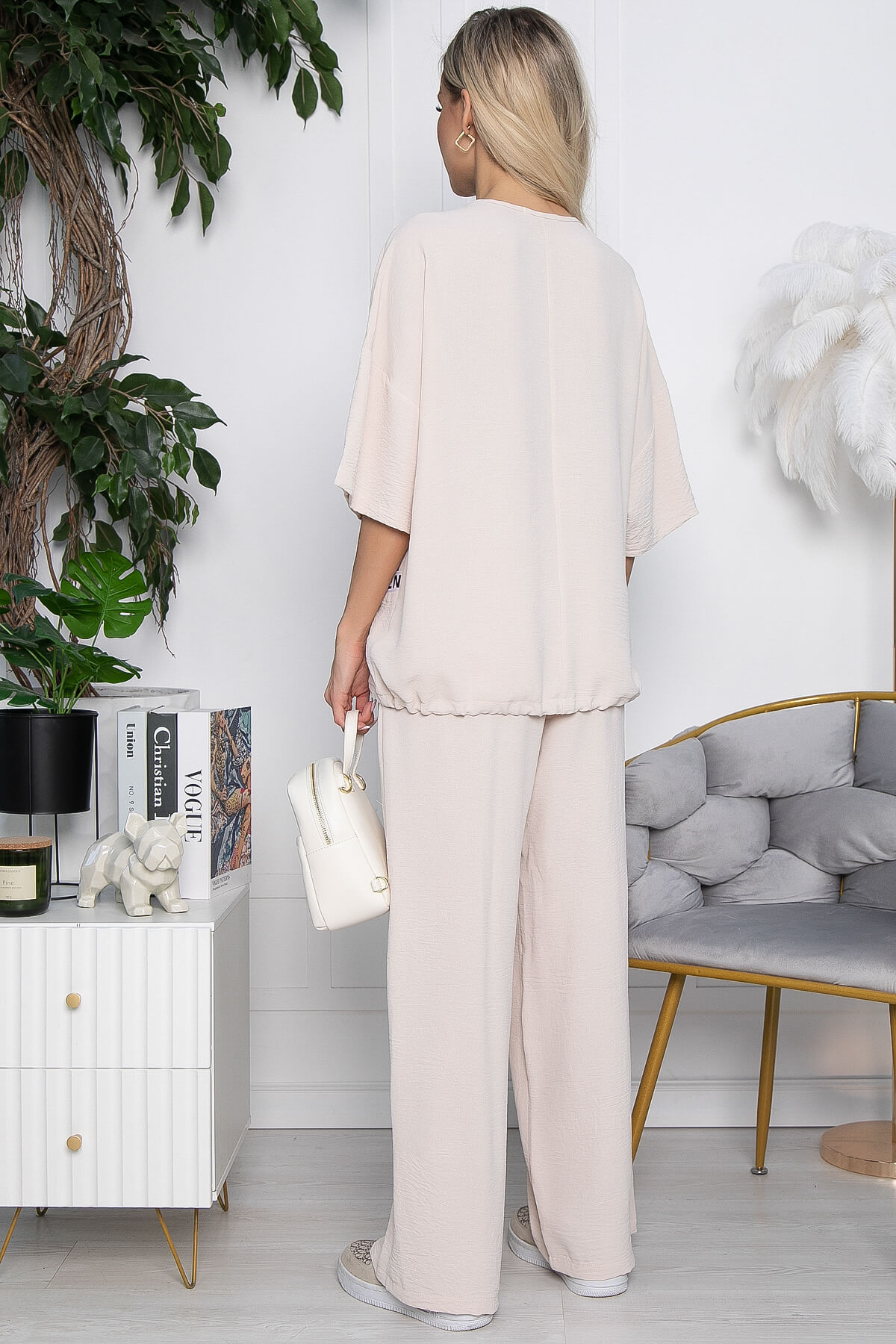 Тренд сезона - лёгкий брючный костюм из приятной струящейся ткани. Оригинальный верх свободного кроя с рукавом-кимоно средней длины и кулиской по низу изделия. Свободные брюки в стиле палаццо придают костюму лёгкость и особый шик. Брюки имеют пояс на комфортной резинке, что позволяет чувствовать себя свободно и не сомневаться при выборе размера. Свободный силуэт костюма подходит абсолютно для любой фигуры. Костюм актуален как для офиса, праздничных мероприятий, так и для романтических встреч.