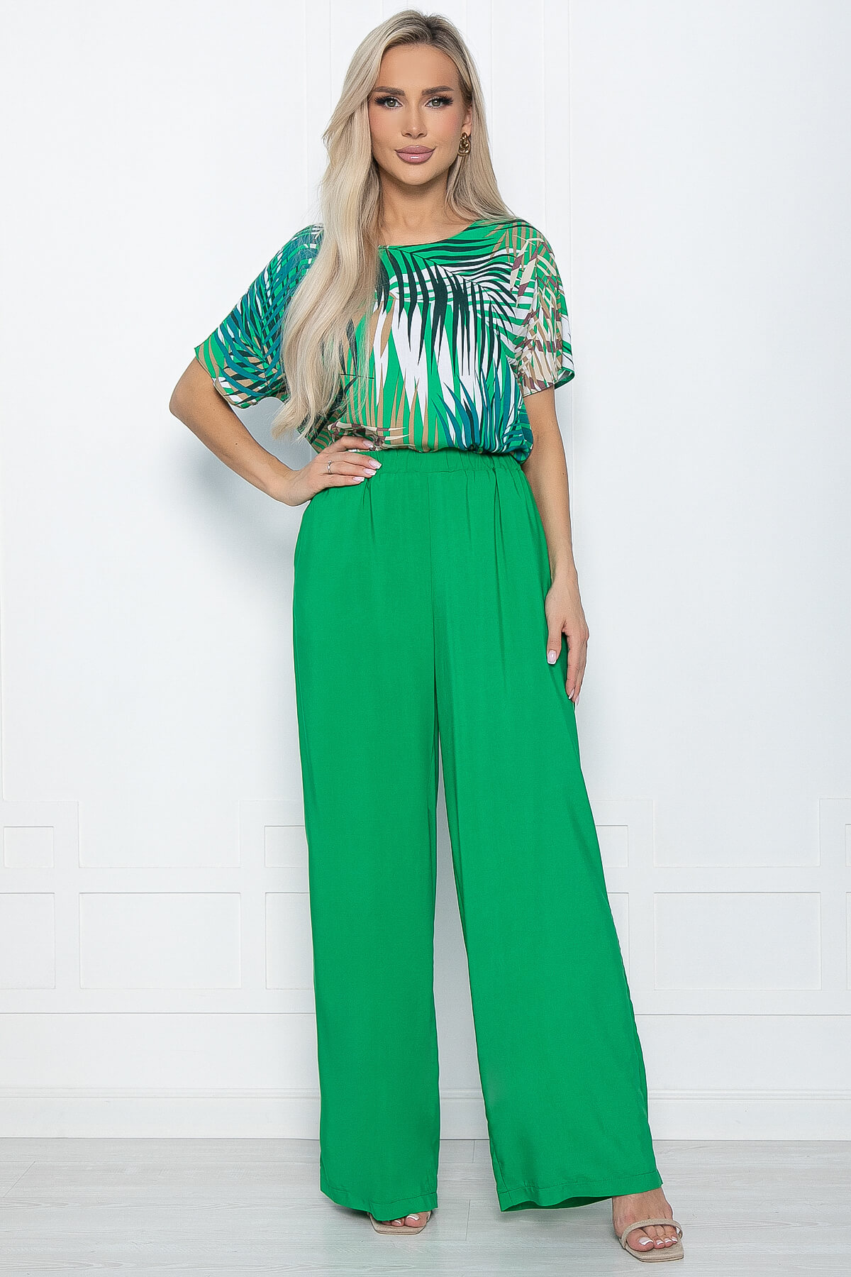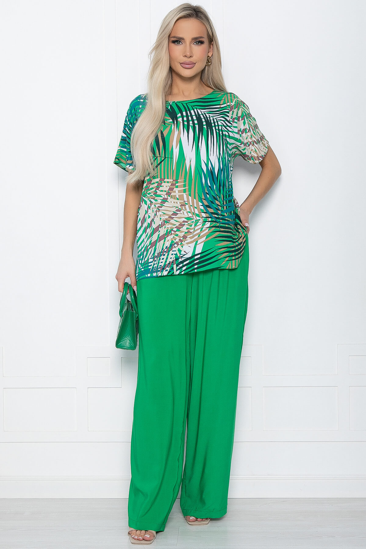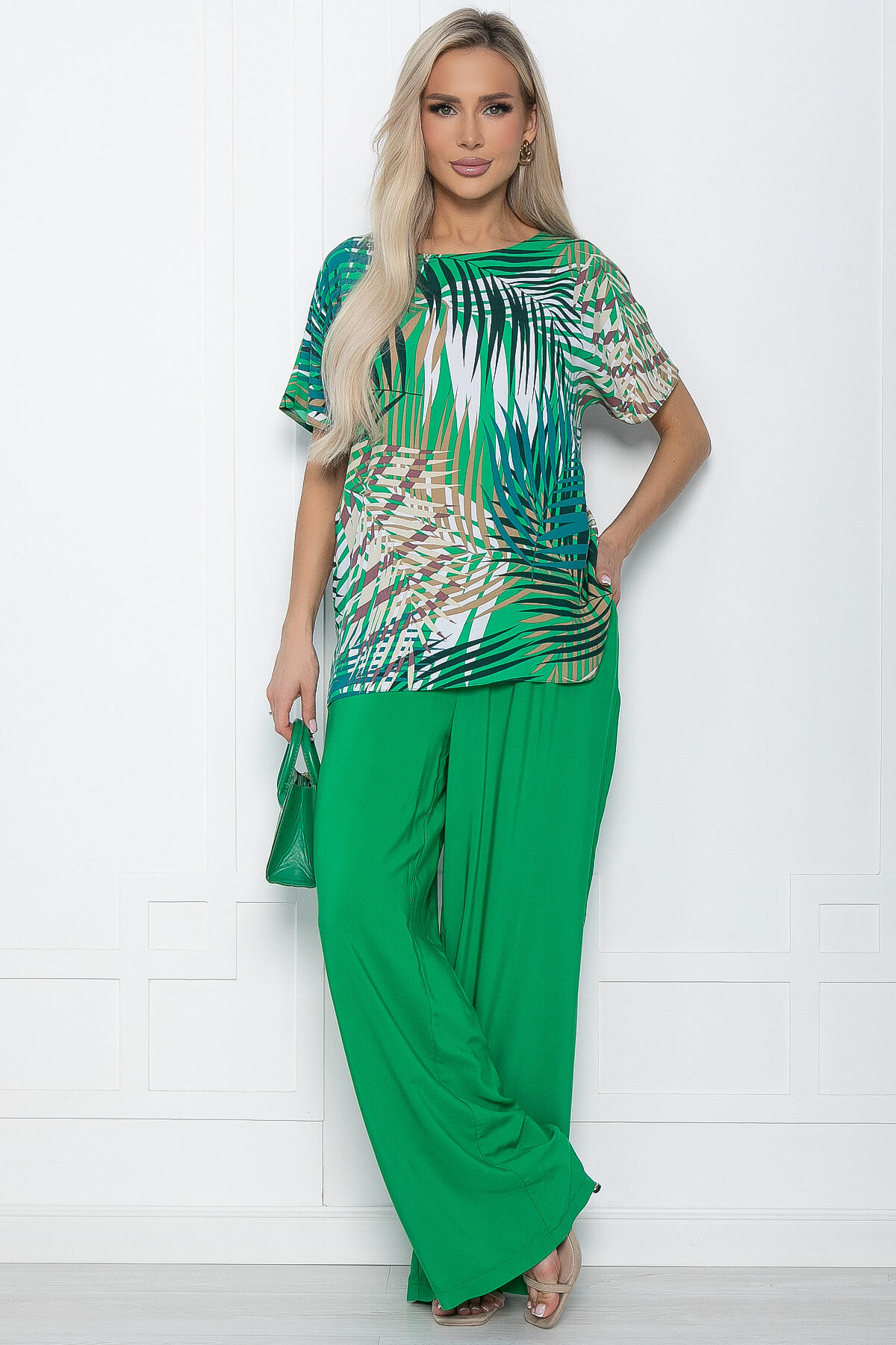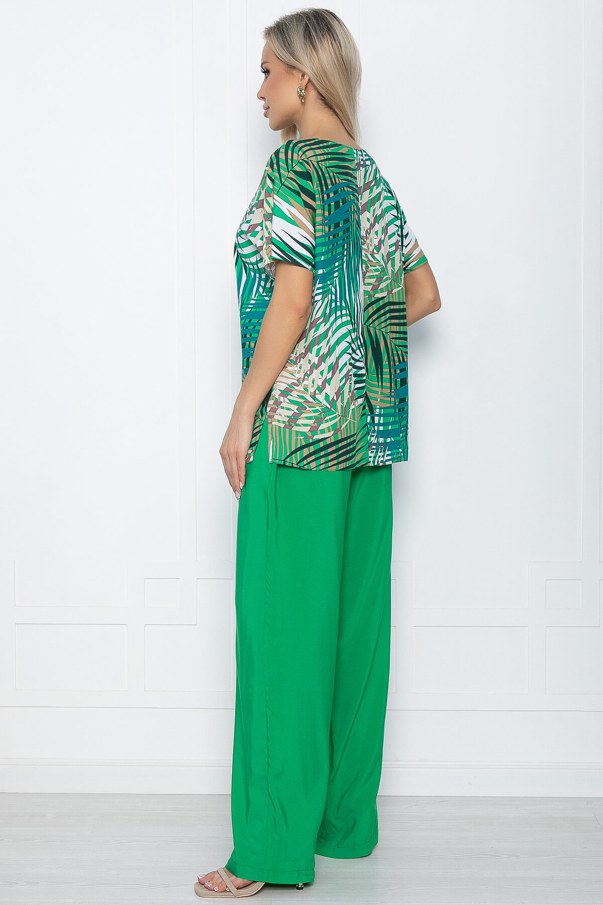 Принт: у верха - листья, брюки однотонные.