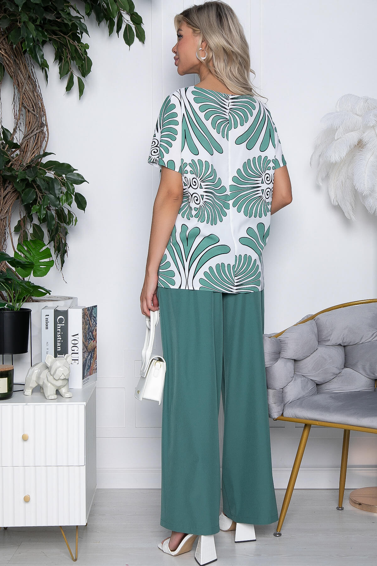 Стильный летний костюм превосходно подходит для прогулки, поездки или отдыха. Такая модель хороша тем, что её можно носить не только в комплекте, но и по отдельности! Брюки имеют пояс на комфортной резинке, карманы расположены сбоку. Блузка со спущенным плечом, и с разрезами по бокам.