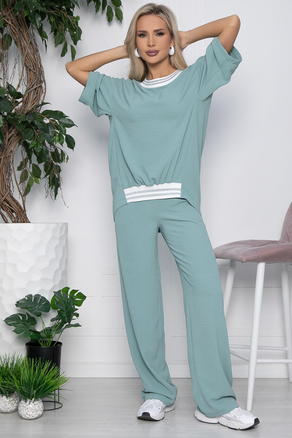 Безупречный костюм, состоящий из свободной блузы и свободных брюк. Комплект удобен тем, что даёт возможность миксовать вещи, создавая множество стильных образов каждый день! Рукав укороченный, втачной. Сложно придумать более комфортный вариант для расслабленного повседневного образа.