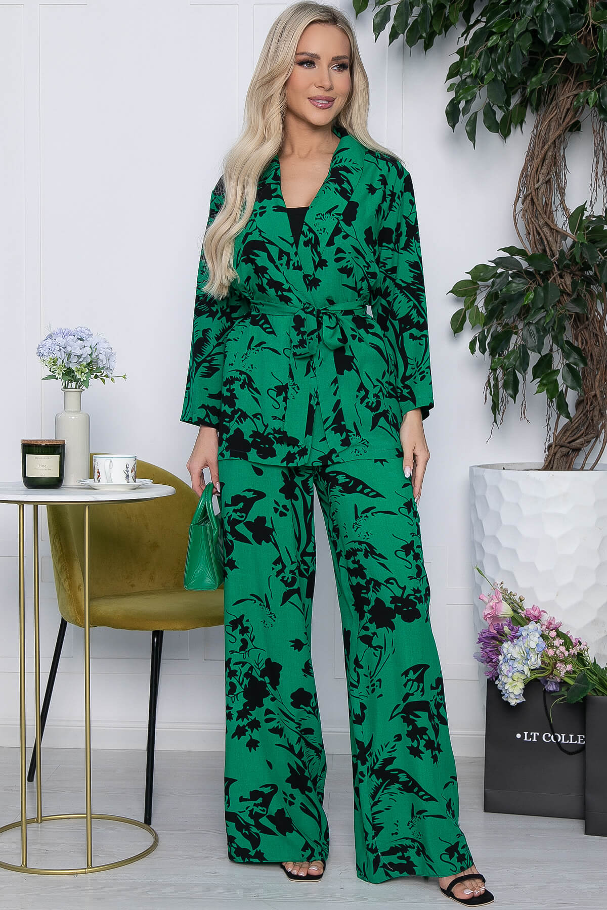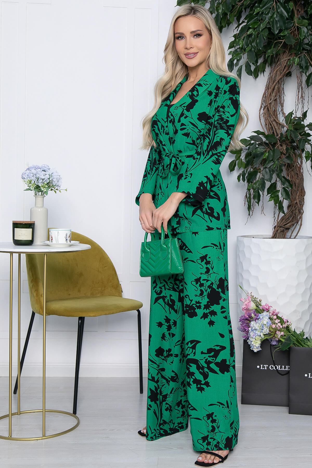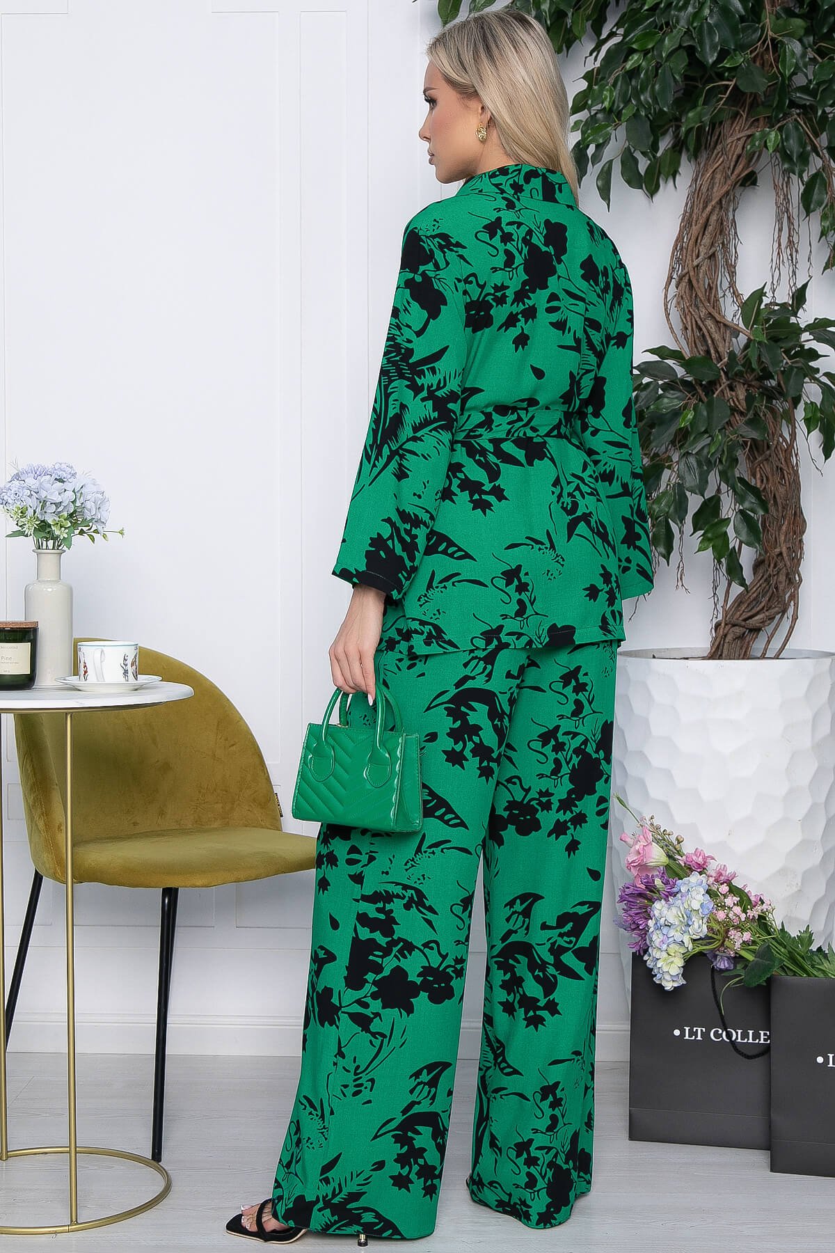 Костюм из лёгкой ткани идеально подойдёт для летнего расслабленного образа. Свободный крой не сковывает движений и дарит комфорт. Рукав три четверти, со спущенным плечевым швом. В комплект входит пояс из основной ткани, который позволит подчеркнуть преимущества фигуры.