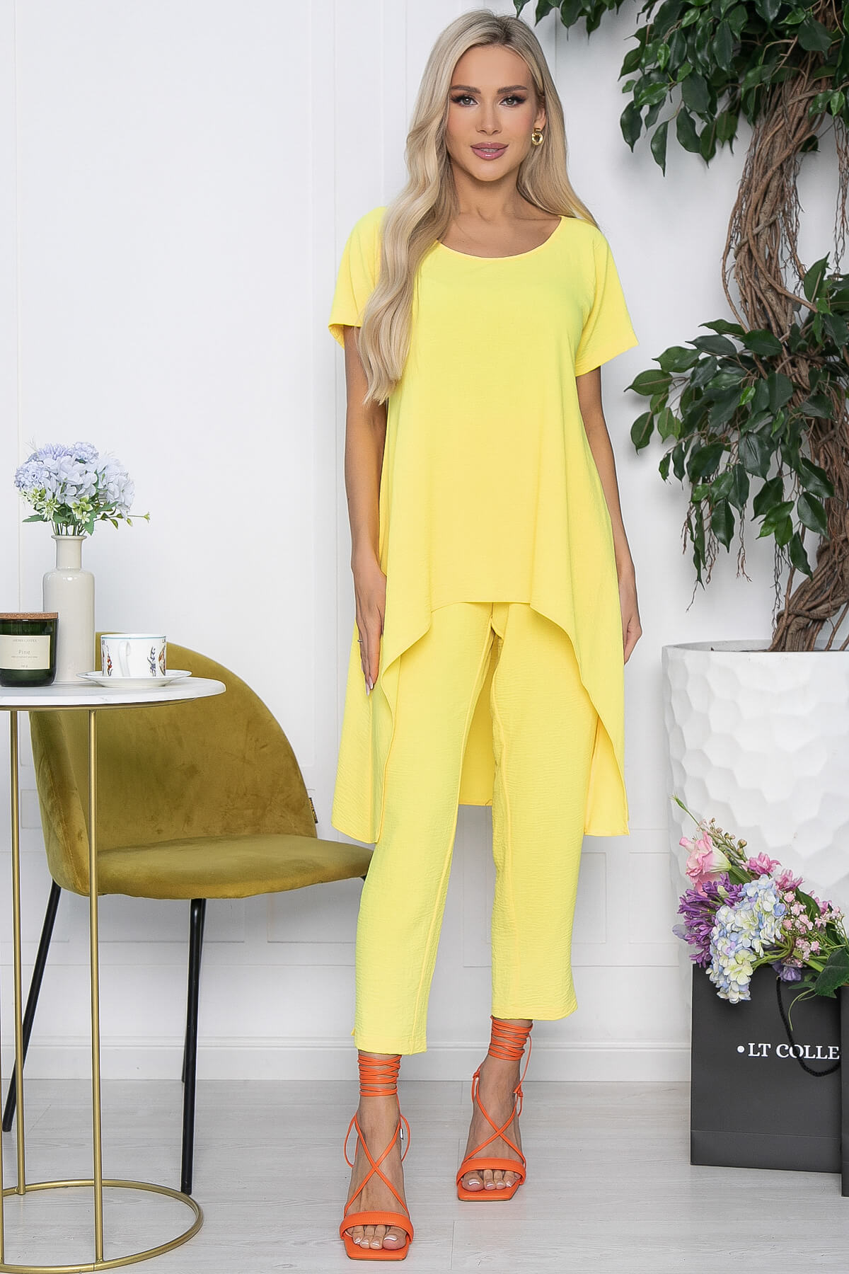 С этим комплектом вы будете ощущать себя комфортно, независимо от того, где вы находитесь. Необычный фасон придаст свежести вашему летнему гардеробу. Костюм состоит из туники и укороченных брюк! Брюки заужены к низу, по бокам снизу разрезы, карманы в боковых швах, талия на резинке. Туника А-силуэта с асимметричным низом, рукав кроя "реглан".