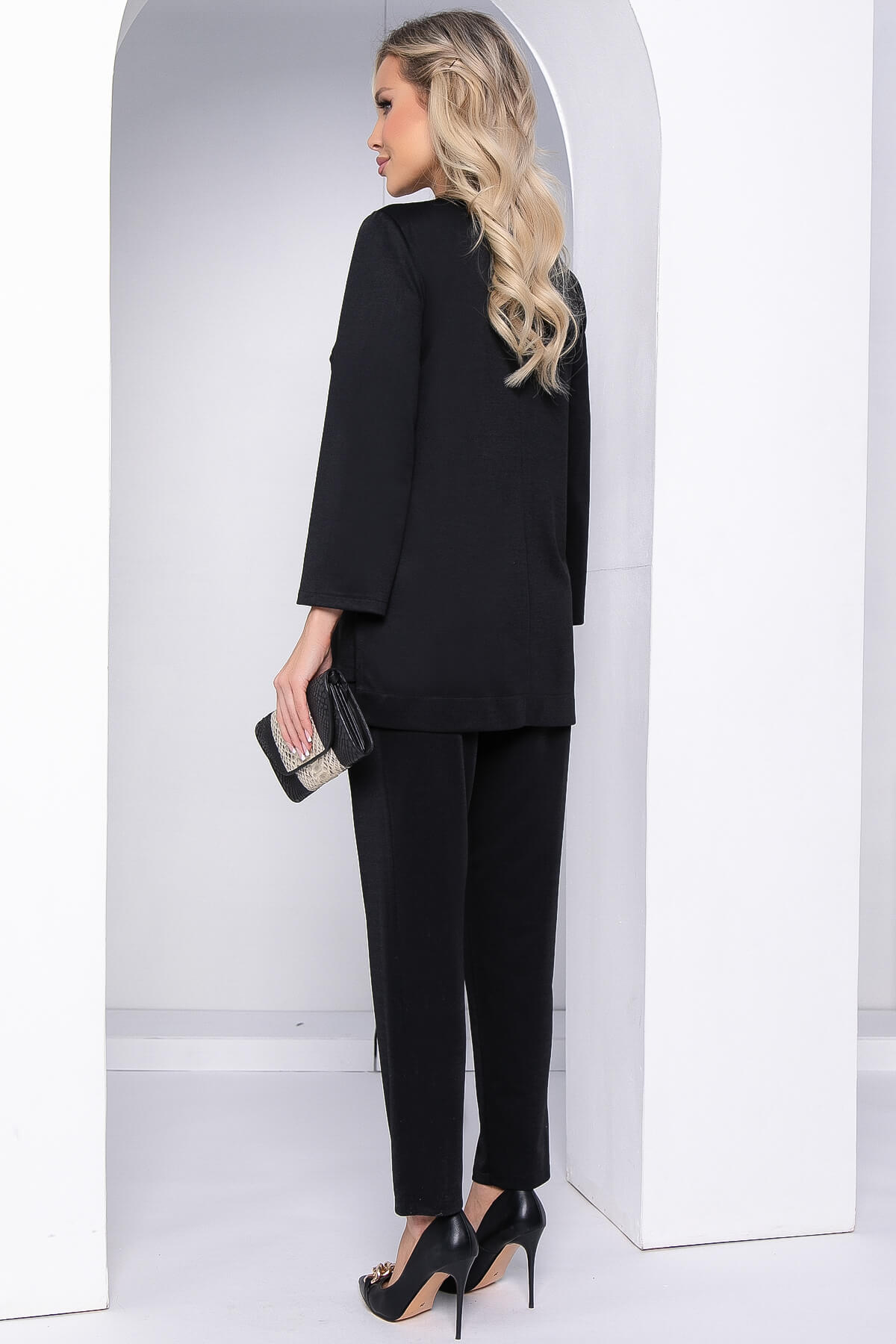 Создайте идеальный образ с новым костюмом из трикотажа с акцентной цепочкой на груди. Брюки удобного кроя по талии оснащены резинкой. Джемпер свободного кроя оформлен дополнительно украшением. Такой костюм прекрасно подойдёт для создания повседневного или делового образа.