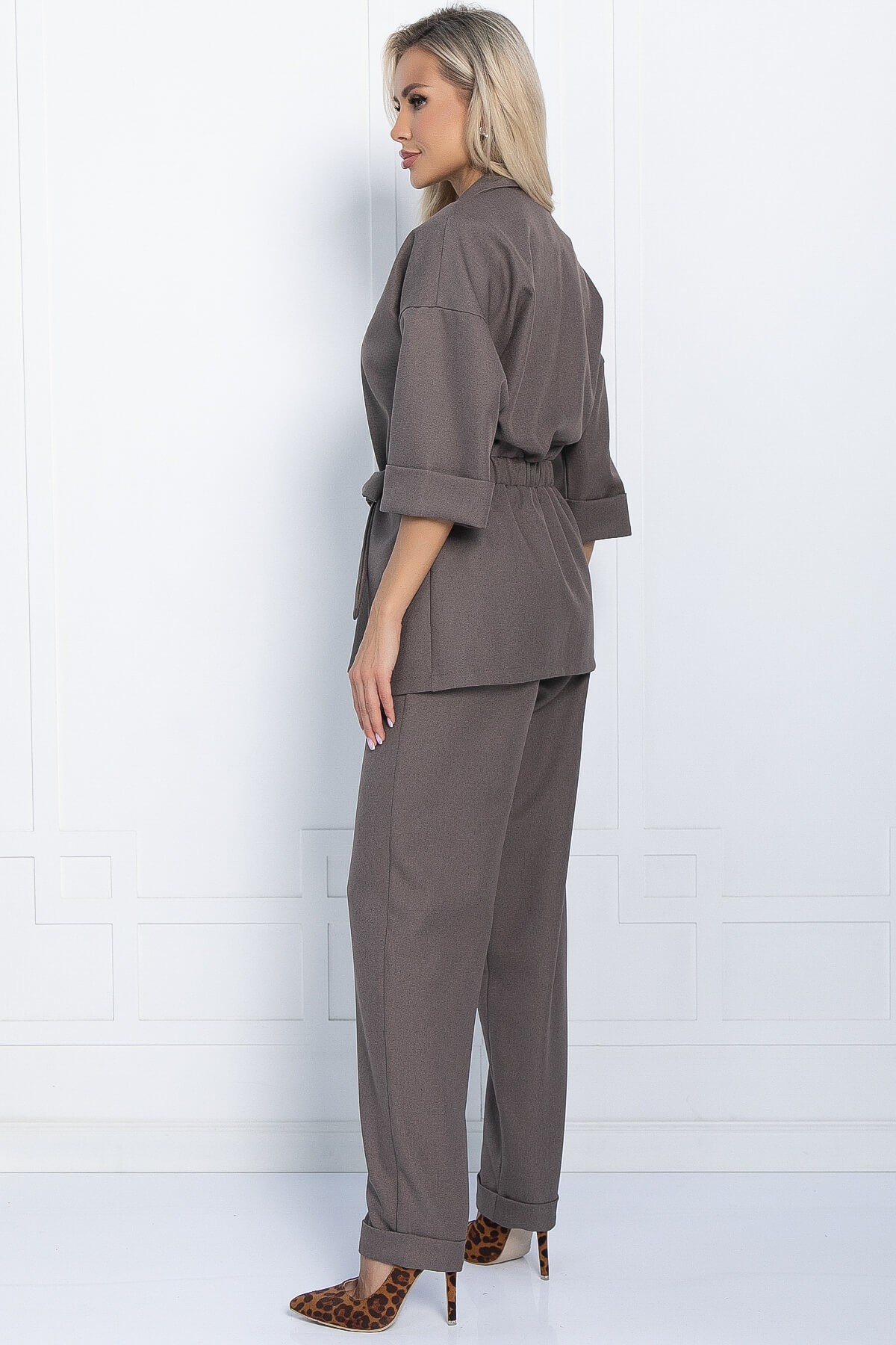 Стильный и удобный костюм в коричневом оттенке, состоящий из пиджака и брюк. Этот костюм — идеальный выбор для офиса, деловых встреч и повседневного использования. Пиджак свободного кроя с английским воротником, декорирован кулиской на резинке, спущенное плечо. Пояс в боковых швах подчеркнет вашу фигуру. Брюки прямого кроя по талии на резинке, в боковых швах расположены карманы. Брюки заужены к низу и декорированы манжетами снизу.