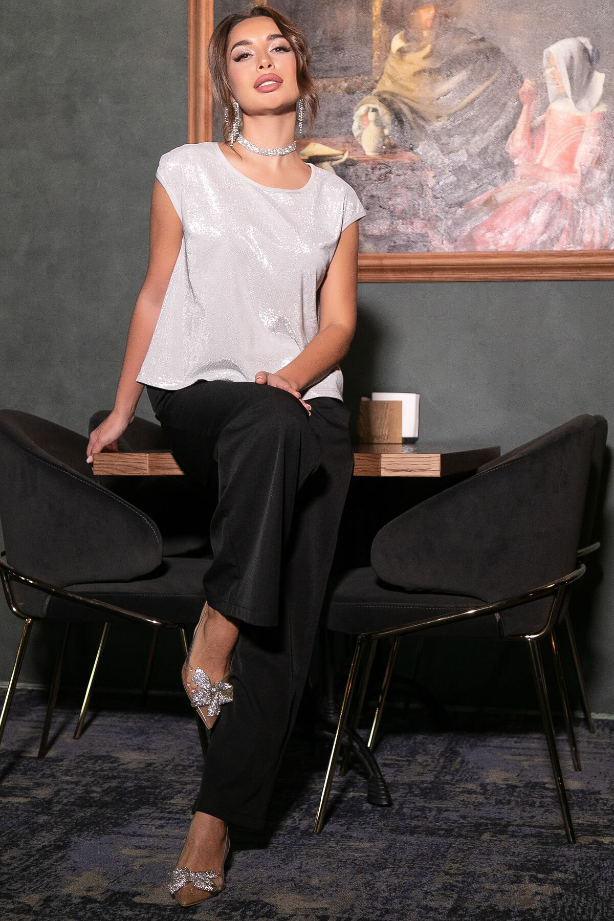 Костюм нарядный с широкими брюками на резинке и мерцающей блузой – это стильный и элегантный комплект, предназначенный для особых случаев и торжественных мероприятий. Широкие брюки на резинке обеспечивают комфортную посадку и свободу движений, а блуза добавляет костюму нотку роскоши. Комплект можно сочетать с различными аксессуарами и обувью.