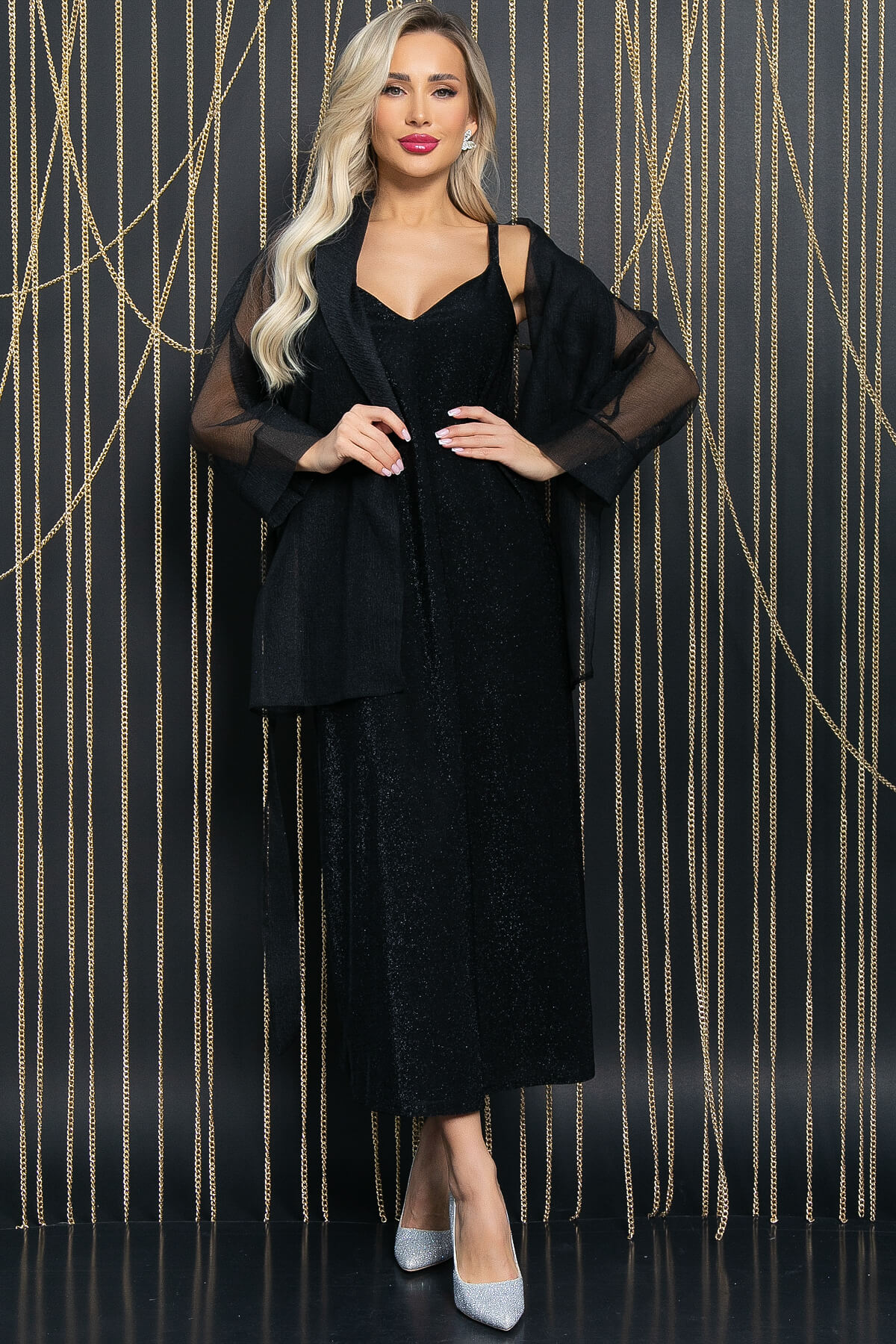 Костюм представляет собой очаровательное длинное платье-комбинацию и жакет из органзы. В сочетании эти два предмета создадут изысканный и утончённый образ, который будет уместен на любом мероприятии. Дополните костюм аксессуарами и обувью, чтобы создать разнообразные и стильные варианты.