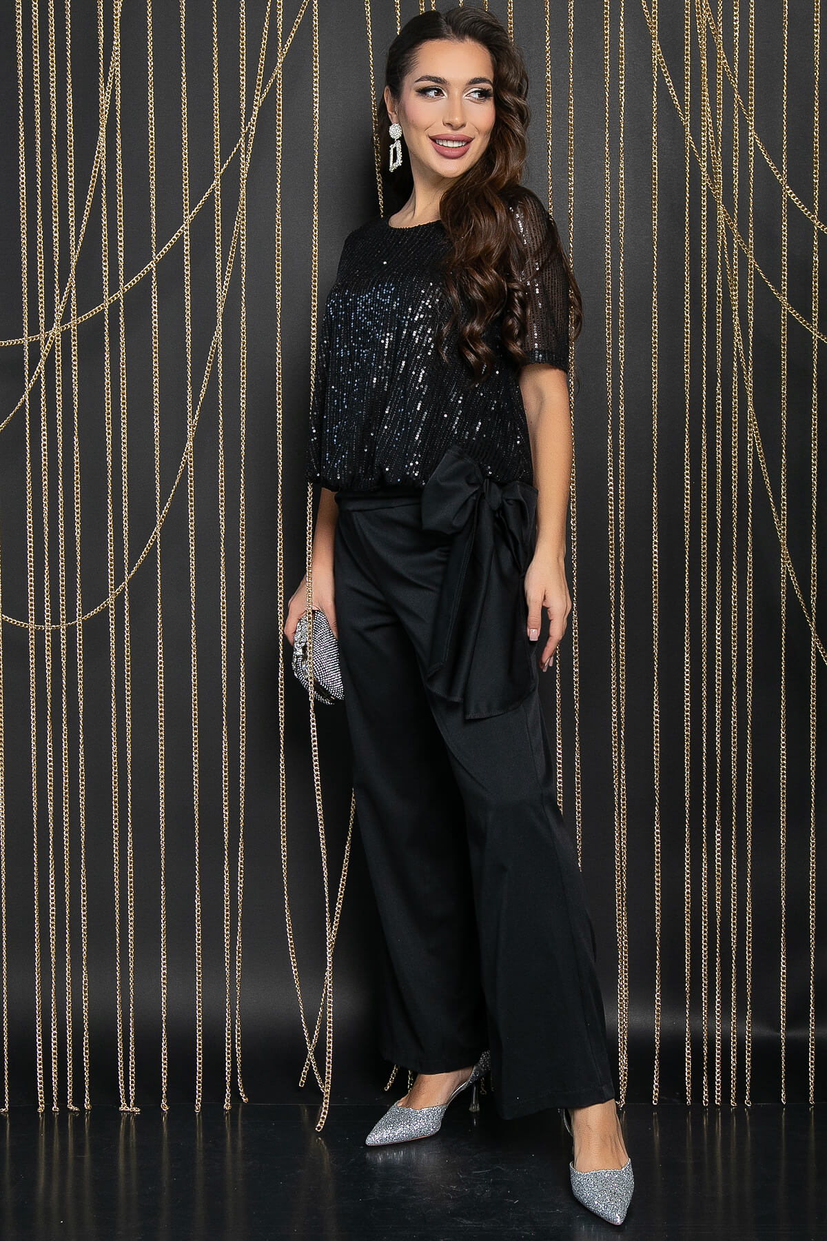 Нарядный костюм создан для тех, кто ищет универсальный и торжественный образ. Верх костюма представлен свободной блузкой с завязками на нижней части. Она выполнена из трикотажа с пайетками, которые придают образу особую праздничность и торжественность. Брюки прямого силуэта со свободной посадкой дополнены резинкой на талии и функциональными карманами, что делает костюм стильным и модным, подходящим для различных мероприятий. Этот брючный костюм-двойка можно легко адаптировать к различным ситуациям — от праздничного ужина до повседневной носки. Бант по низу блузки является несъемной частью изделия.