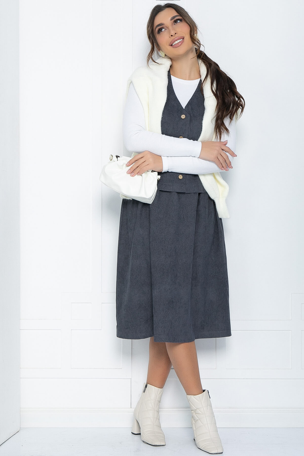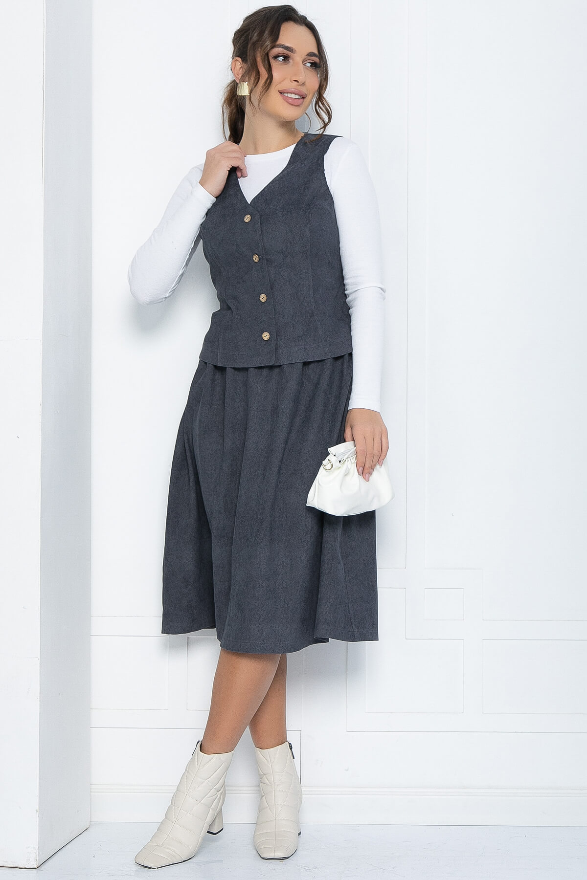 Костюм премиум класса из жилета и юбки, который станет прекрасным дополнением в ваш базовый гардероб! Такой комплект будет отлично смотреться как на деловой встрече, так и на вечеринке или прогулке, добавляя выразительности и строгости в образ. Вельветовый костюм с юбкой и жилетом — это стильный и элегантный наряд, который сочетает в себе классику и современность. Верх на пуговицах без рукавов. Юбка длиной миди, без подкладки.