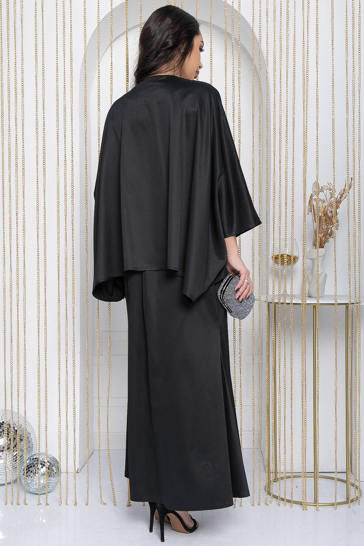 Роскошный костюм-двойка с юбкой — это незаменимый элемент вечернего гардероба! Верхняя часть костюма свободного прямоугольного кроя, на талии располагается пояс, который не переходит на спинку. Горловина украшена стразами и бусинами. Юбка длинная, расклешенная книзу, что придаёт костюму особый шарм и элегантность.