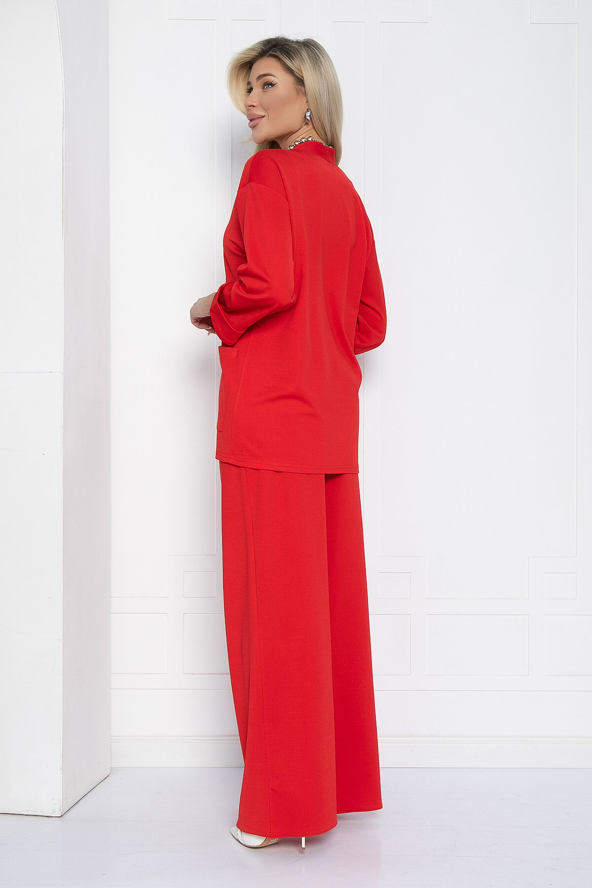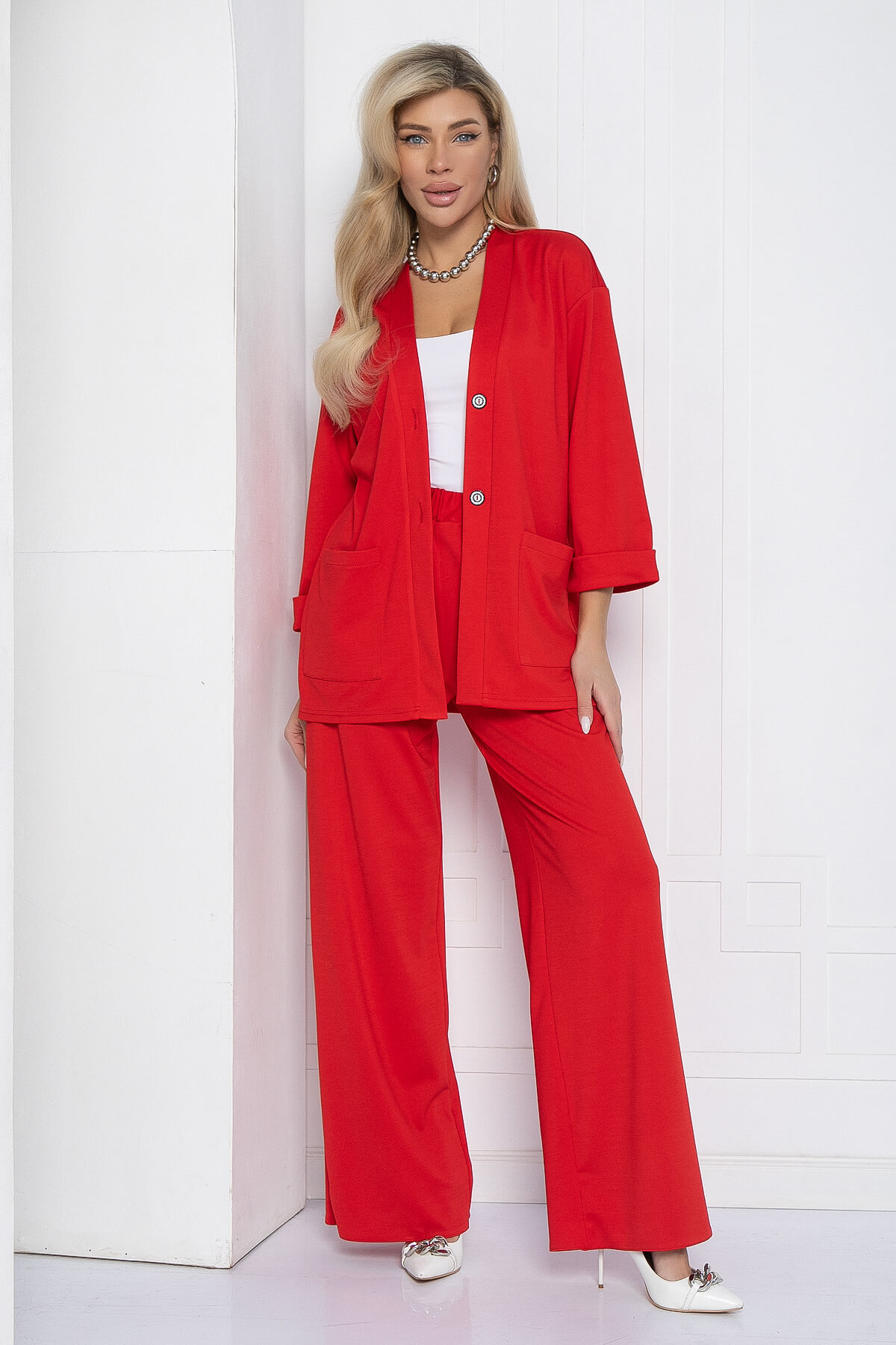 Женский брючный костюм полуприлегающего силуэта — это превосходный выбор для тех, кто стремится выглядеть элегантно и при этом оставаться в комфорте в любую погоду. Жакет с пуговицами и слегка приспущенными рукавами обеспечивает полную свободу движений, позволяя вам чувствовать себя уверенно и свободно. Брюки палаццо с резинкой на талии и карманами добавляют практичности и удобства, что делает этот костюм поистине универсальным и подходящим для различных ситуаций.