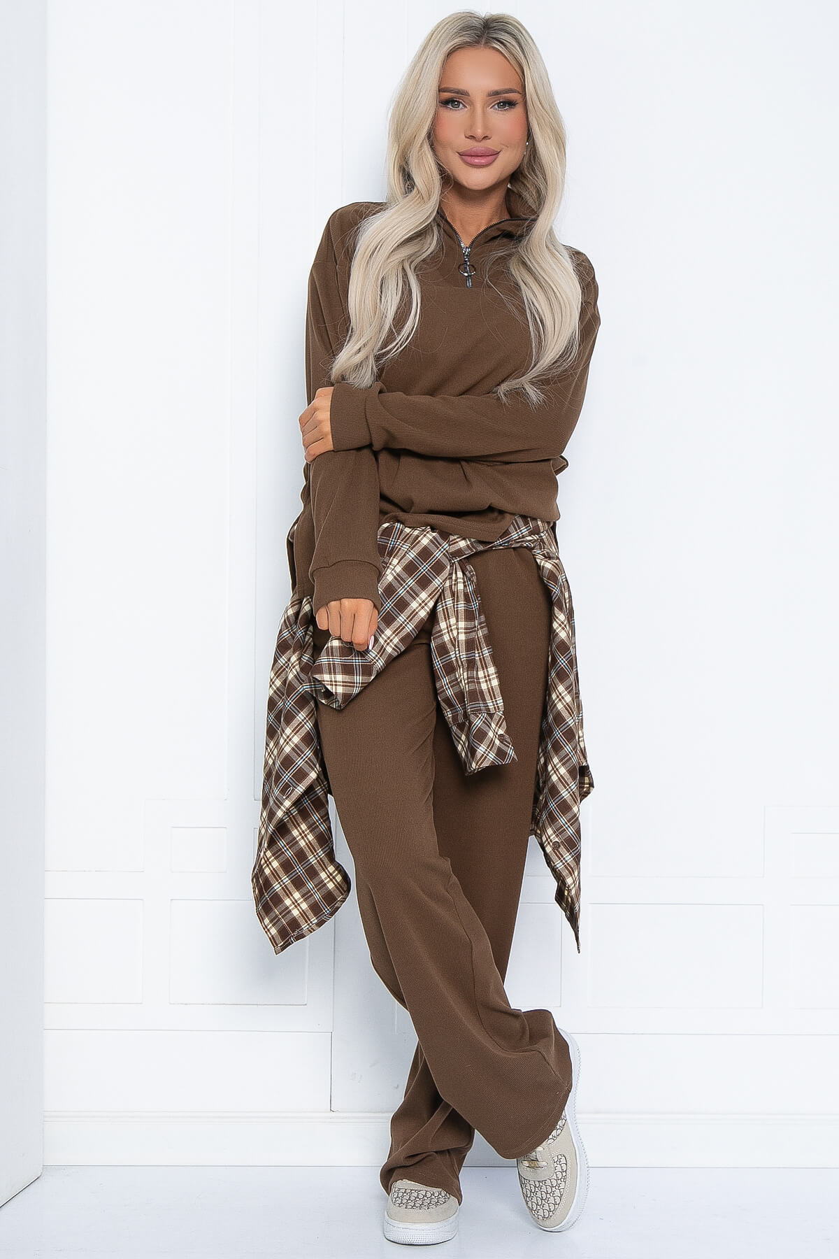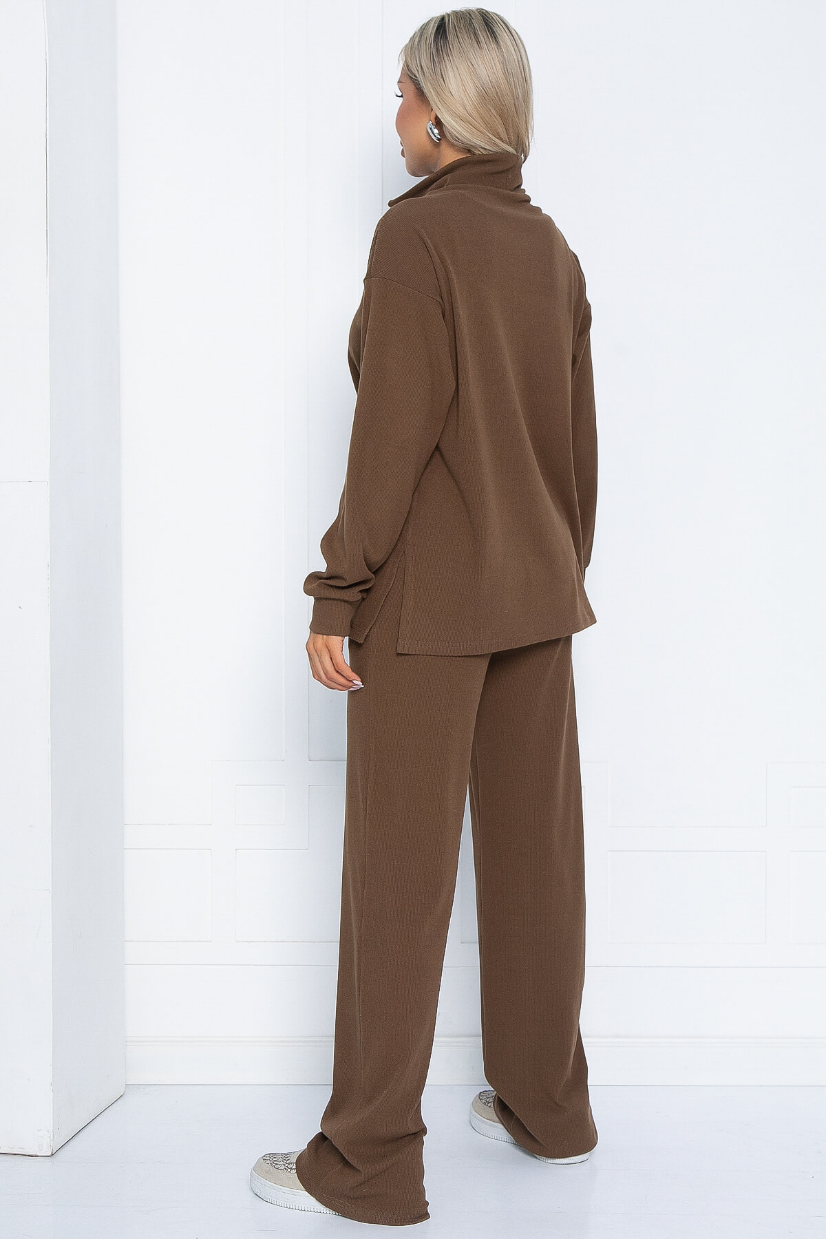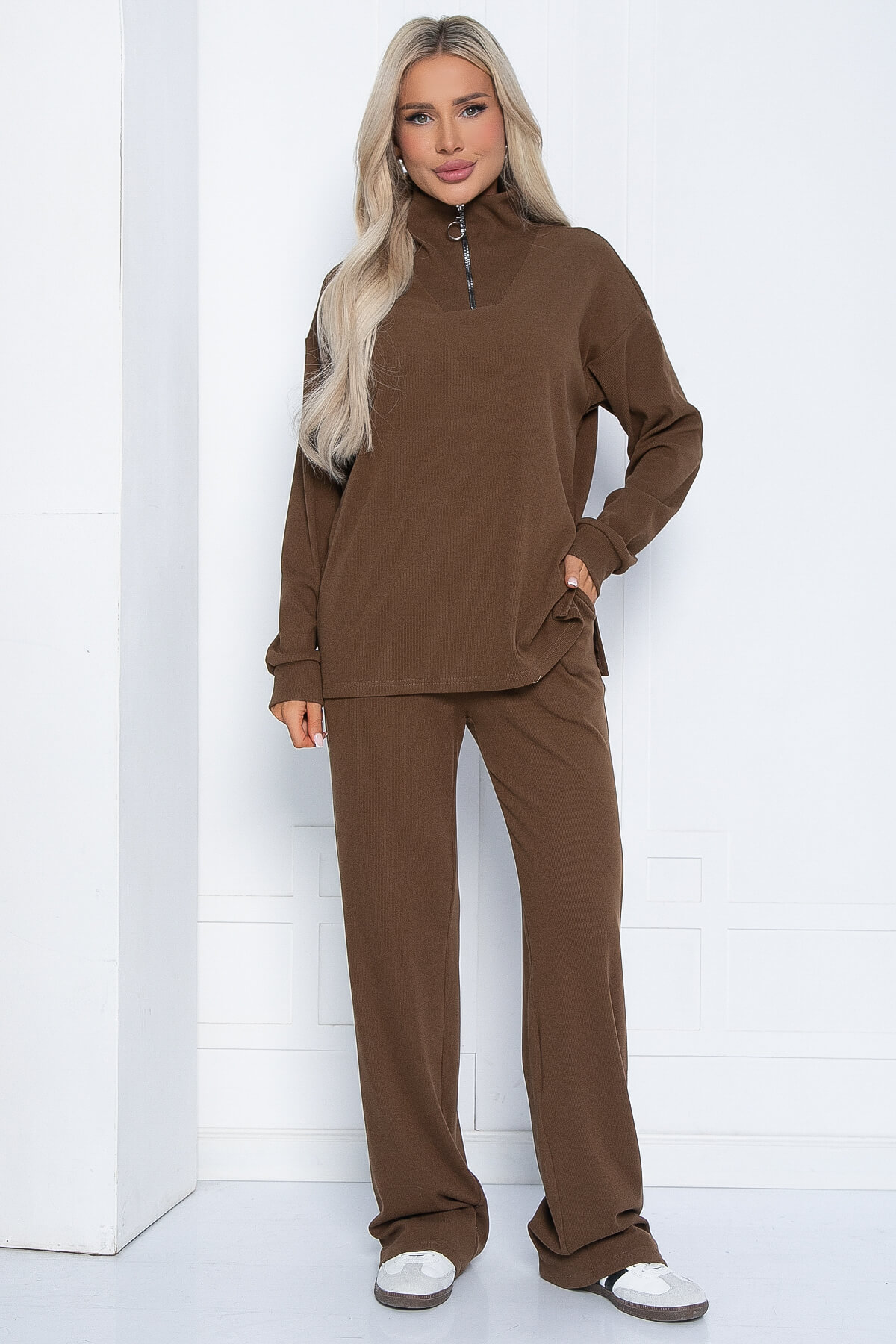 Теплый и уютный костюм станет вашим любимым! Ведь он идеально подходит для повседневных прогулок в прохладное время года. Джемпер с высоким воротом-стойкой с молнией согреет в непогоду. Рукав длинный, втачной. Брюки прямые, в боковых швах есть карманы.