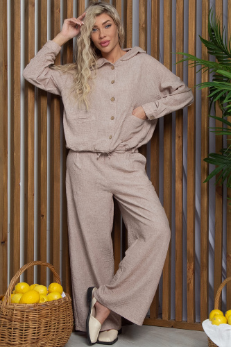 Летний костюм оверсайз изо льна — прекрасный выбор в тёплую погоду. Прямая куртка без подклада с капюшоном и свободные брюки создают демократичный образ. Куртка с застёжкой на пуговицы, с притачным поясом и кулиской, рукав-реглан с манжетом, застёгивающийся на пуговицу. Накладные карманы с прорезным входом «в рамку» удобны и практичны. Брюки прямого кроя с притачным поясом и застёжкой на «молнию». Резинка в поясе на спинке и защип спереди обеспечивают комфорт. В боковых швах карманы. Куртку можно носить нараспашку, подобрав к ней топ или футболку нейтрального оттенка. Костюм можно носить как единый, так и по отдельности, что позволяет создавать новые образы.