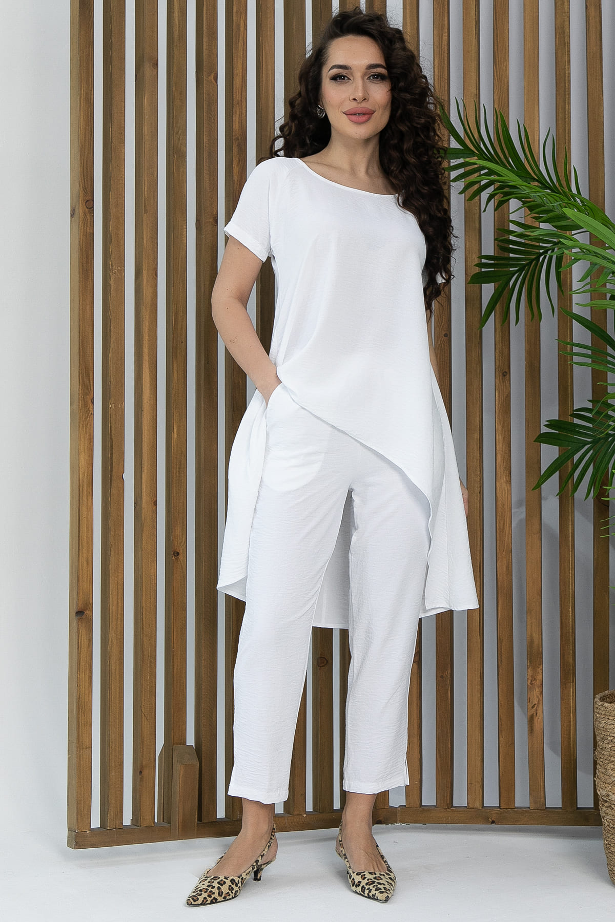 С этим комплектом вы будете ощущать себя комфортно, независимо от того, где вы находитесь. Необычный фасон придаст свежести вашему летнему гардеробу. Костюм состоит из туники и укороченных брюк! Брюки заужены к низу, по бокам снизу разрезы, карманы в боковых швах, талия на резинке. Туника А-силуэта с асимметричным низом, рукав кроя «реглан».