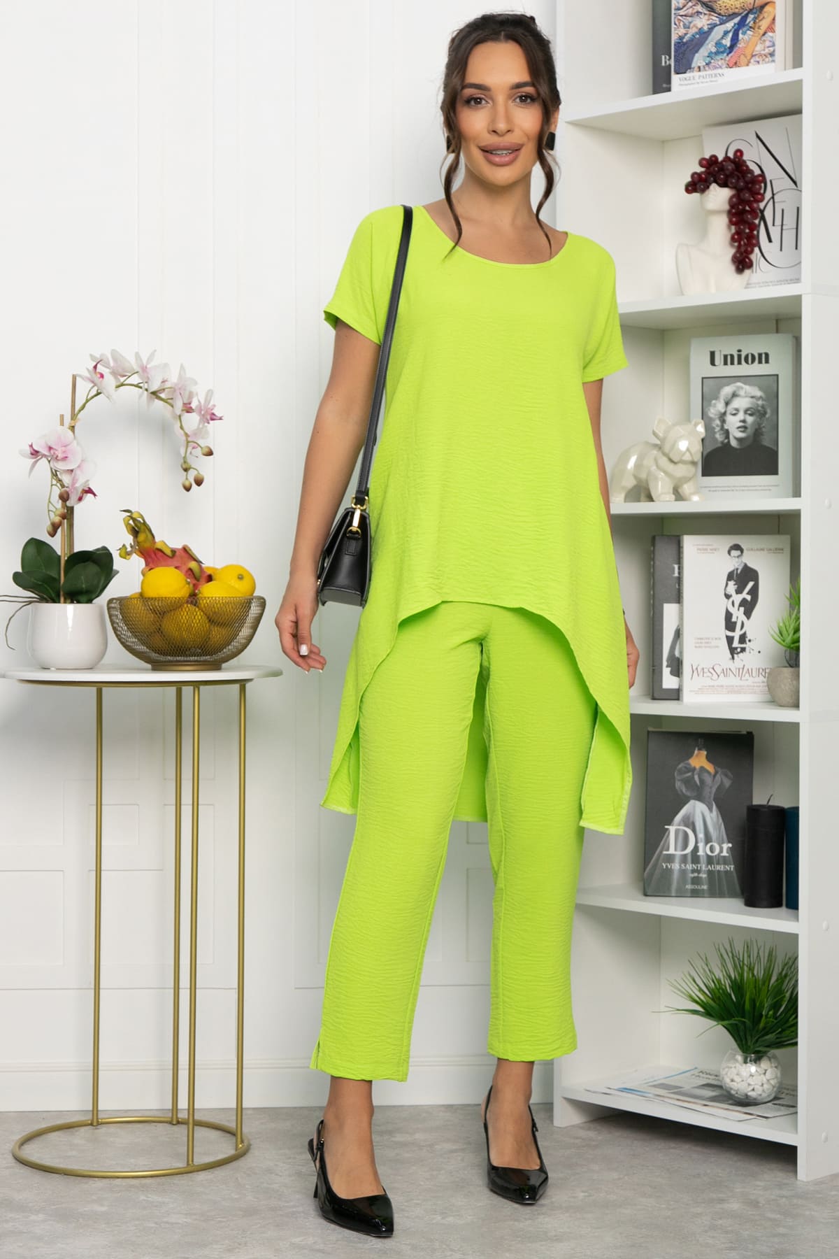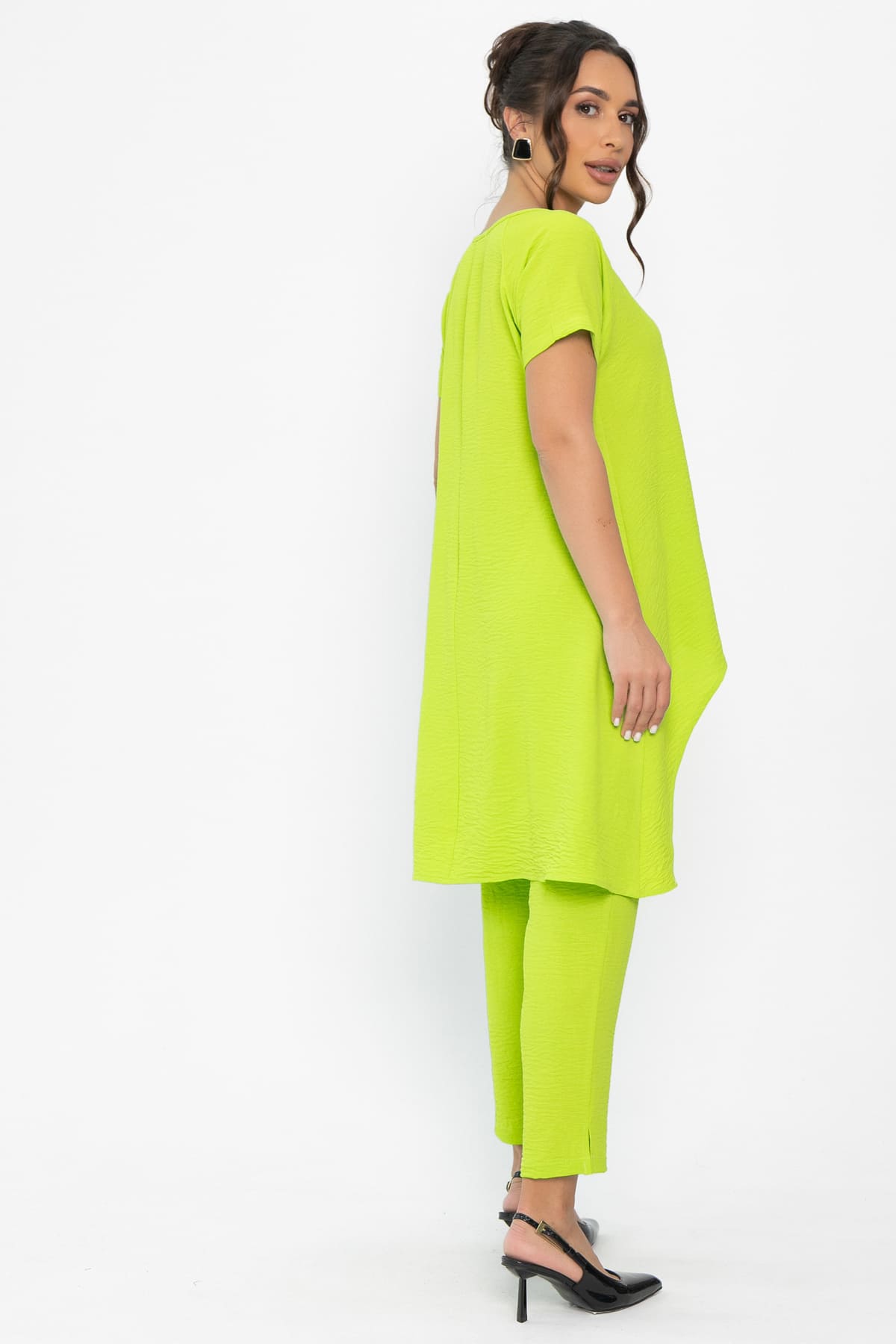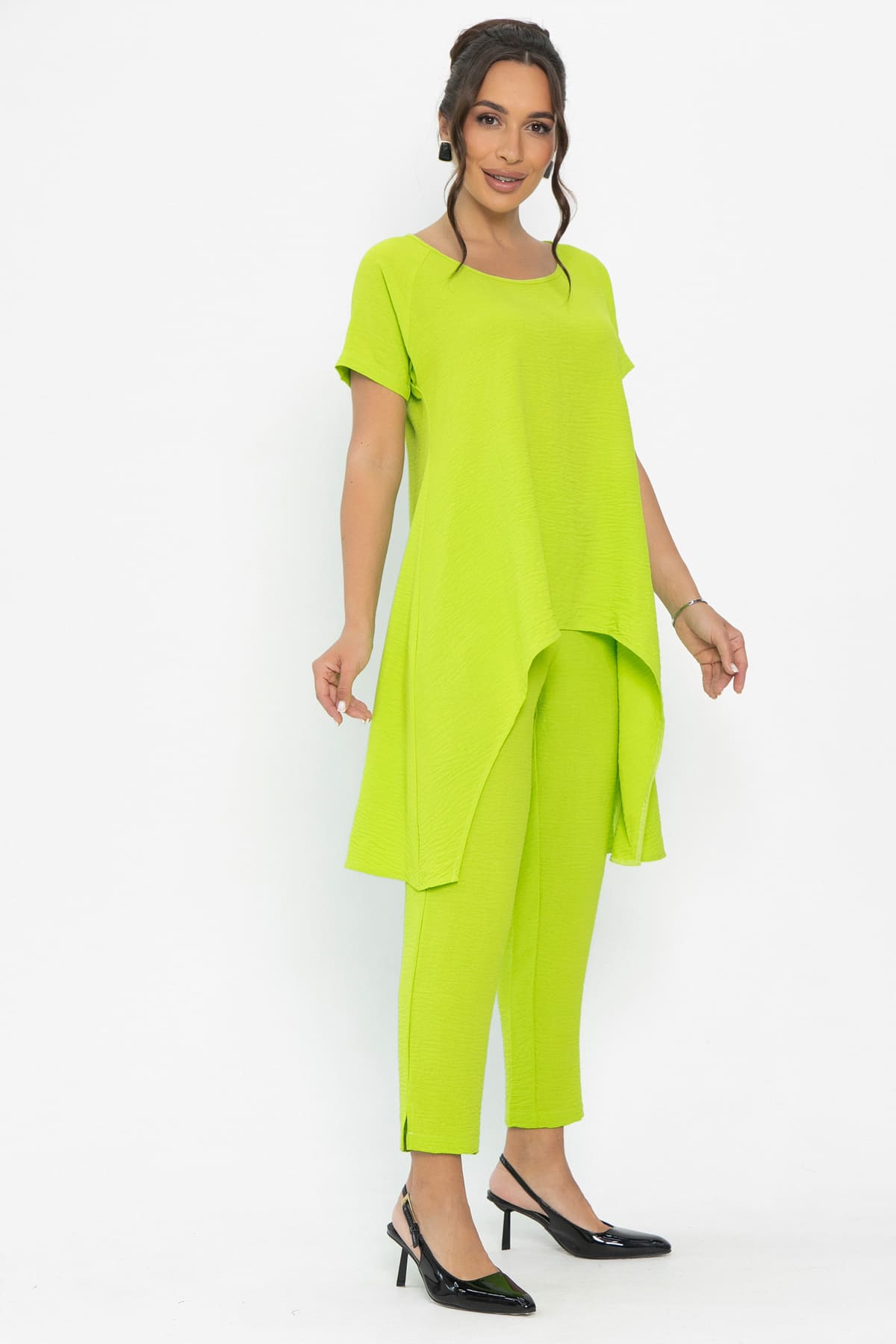 С этим комплектом в лаймовом оттенке вы будете ощущать себя комфортно, независимо от того, где вы находитесь. Необычный фасон придаст свежести вашему летнему гардеробу. Костюм состоит из туники и укороченных брюк! Брюки заужены к низу, по бокам снизу разрезы, карманы в боковых швах, талия на резинке. Туника А-силуэта с асимметричным низом, рукав кроя «реглан».