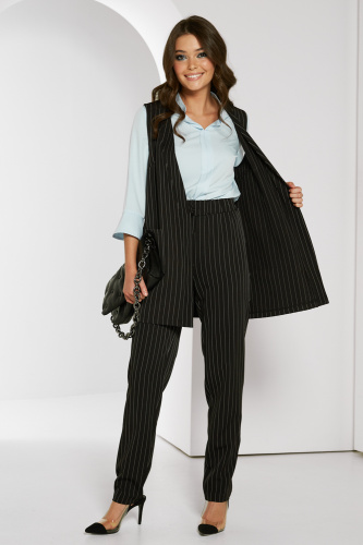 - Модный комплект из костюмной ткани в черном оттенке в полоску состоит из удлиненного жилета и классических брюк;