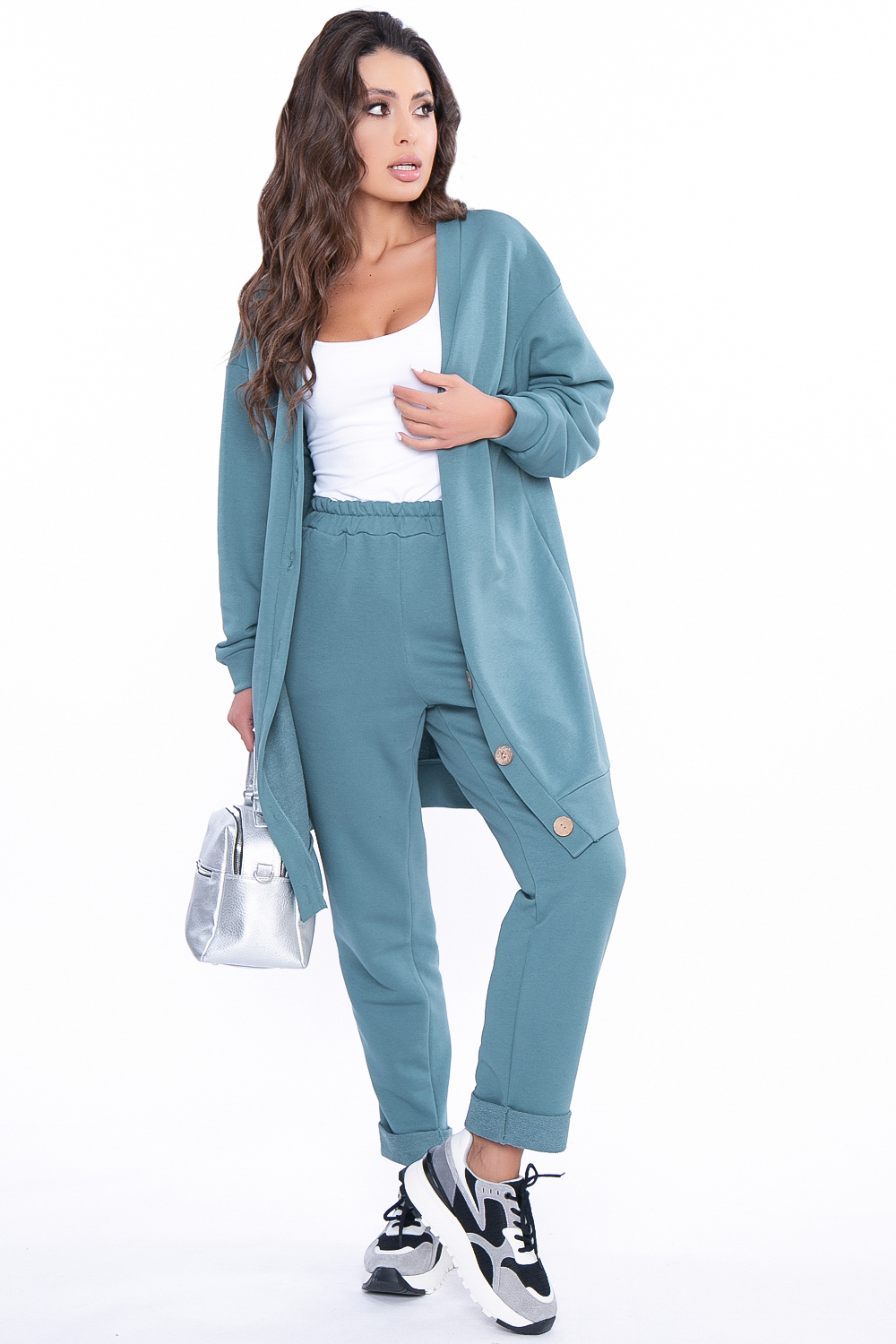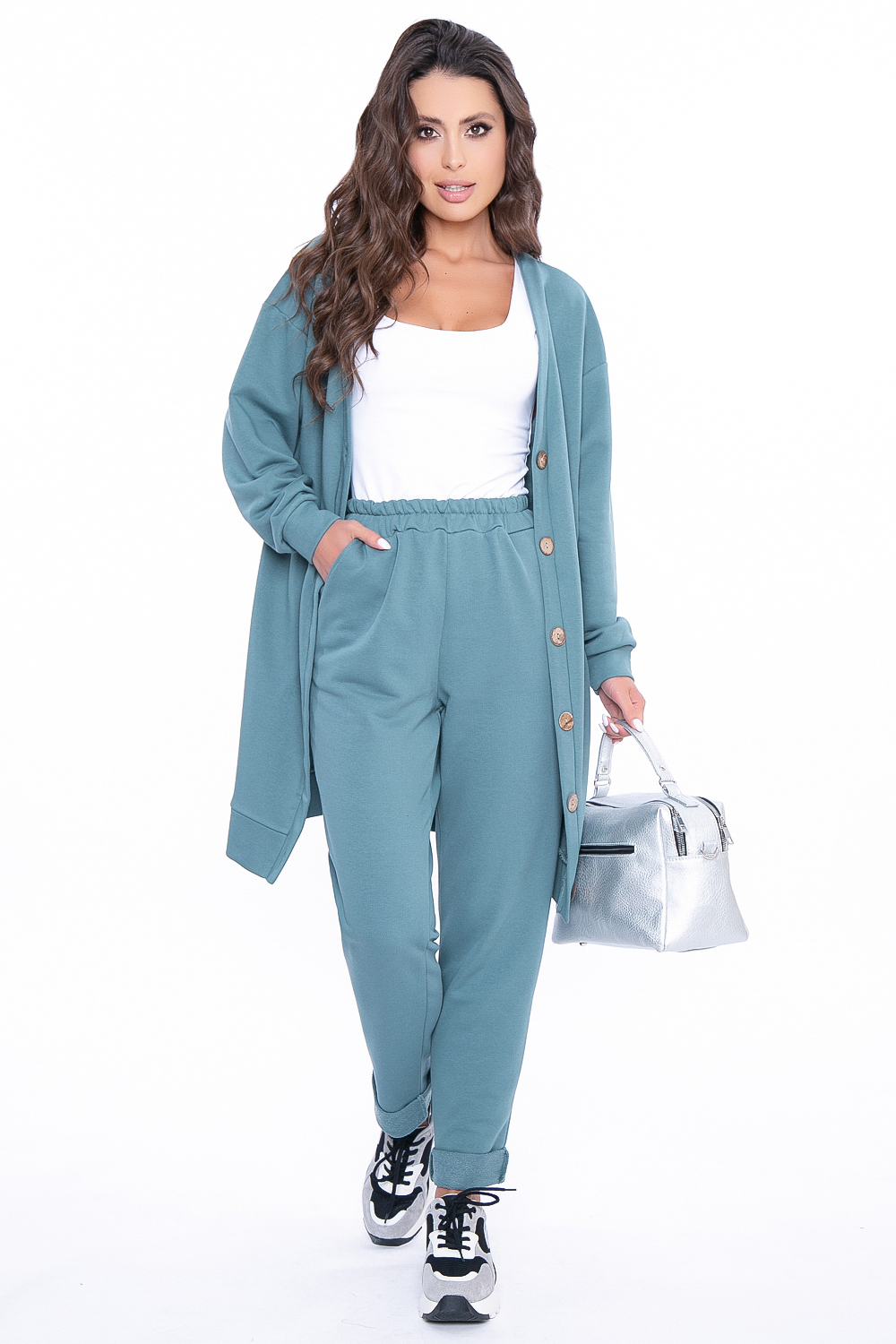 - Брюки на резинке, в боковых швах расположены удобные карманы, по низу отвороты;