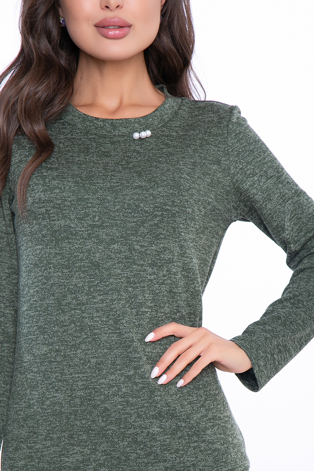 - Классическая округлая горловина с декоративным элементом в виде трёх жемчужин;