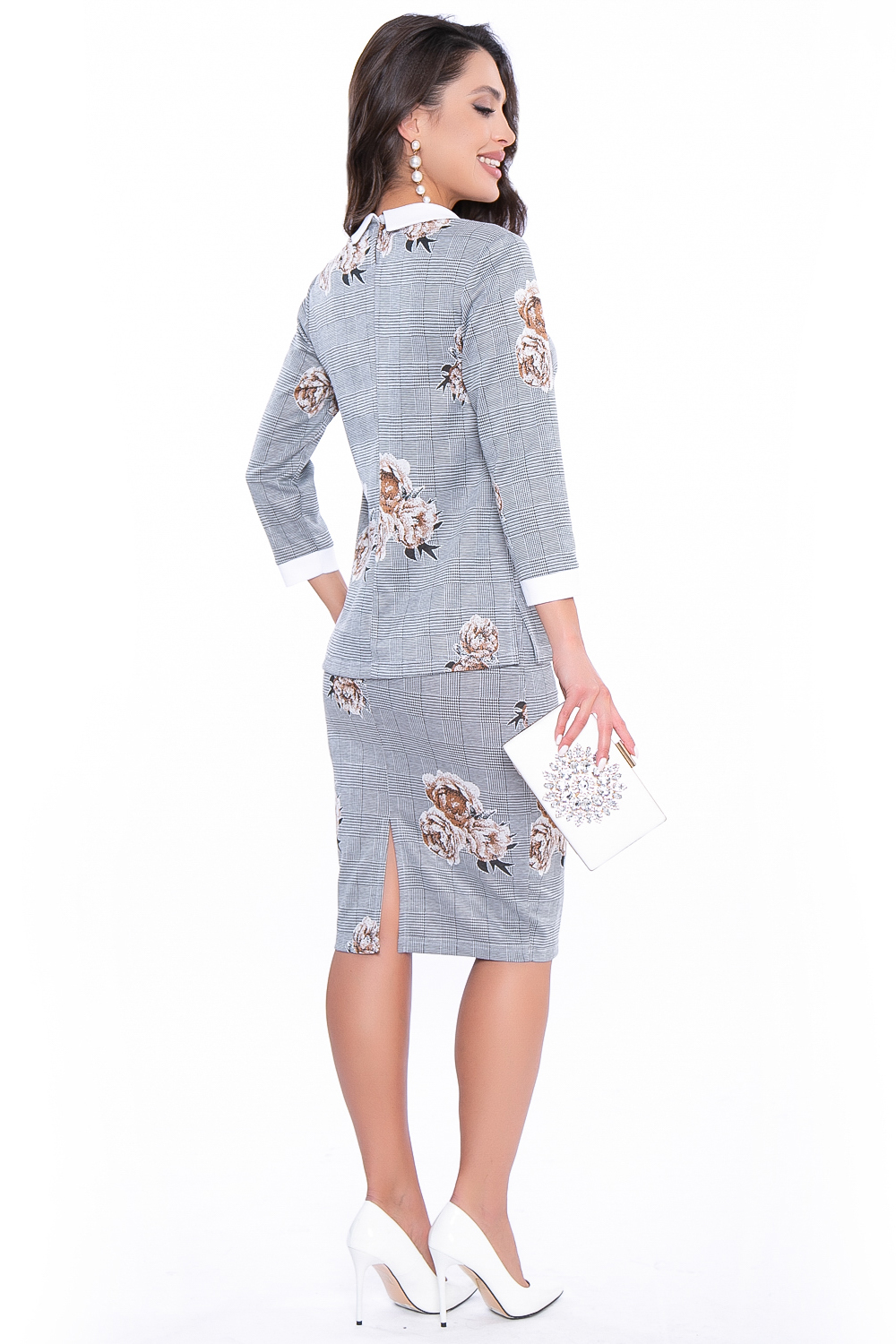 - Трикотажный красивый костюм состоит из джемпера с белым отложным воротничком и юбки-карандаш;