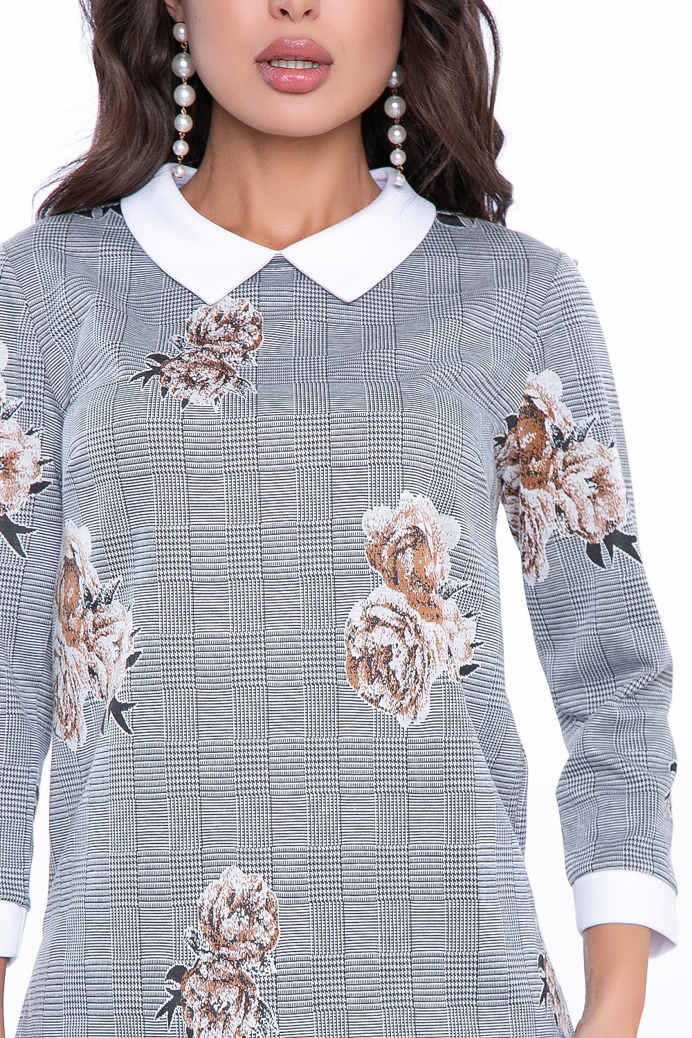 - Комбинированный джемпер, имитирующий свитер поверх белой рубашки. Приталенный силуэт, острый отложной воротник, застегивается на пуговку по спинке;
