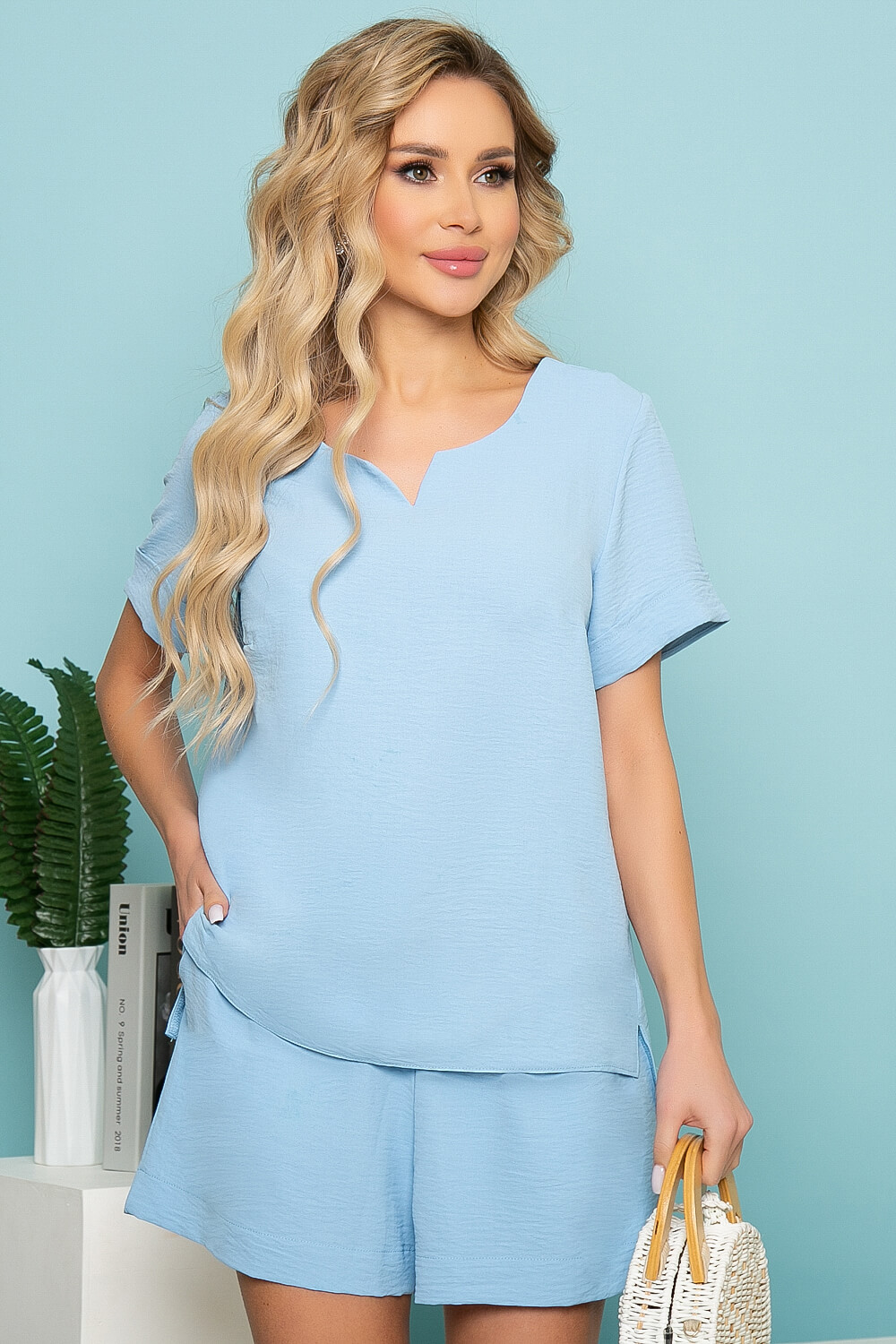 Костюм с шортами из вискозы – отличный выбор для тёплой погоды. Можно надеть туфли или босоножки, а можно сандалии или кеды, в любом случае, Вы будете выглядеть превосходно! Шорты свободного кроя по спинке на резинке, в боковых швах есть удобные карманы. Блуза свободного кроя, рукав втачной, короткий, с отворотом. Спинка удлинена, по бокам разрезы. Мягкий округлый вырез горловины с V-образным акцентом.
