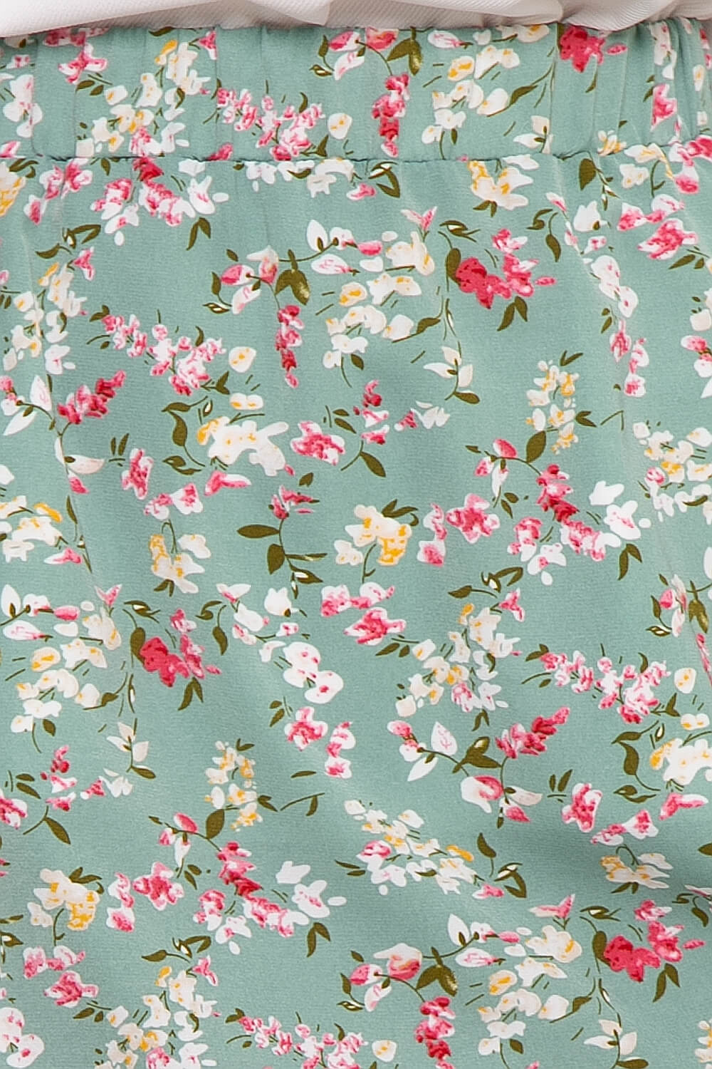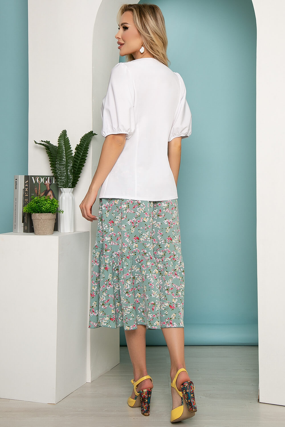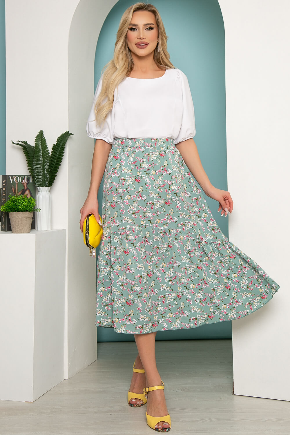 Очаровательный костюм из двух предметов: летящей юбки и блузы. Блуза свободного кроя. Мягкий, округлый вырез горловины, рукав втачной, скроен по типу "фонарик". Юбка с высокой посадкой, на резинке, А-силуэта, по низу волан на сборке с переходом длины.