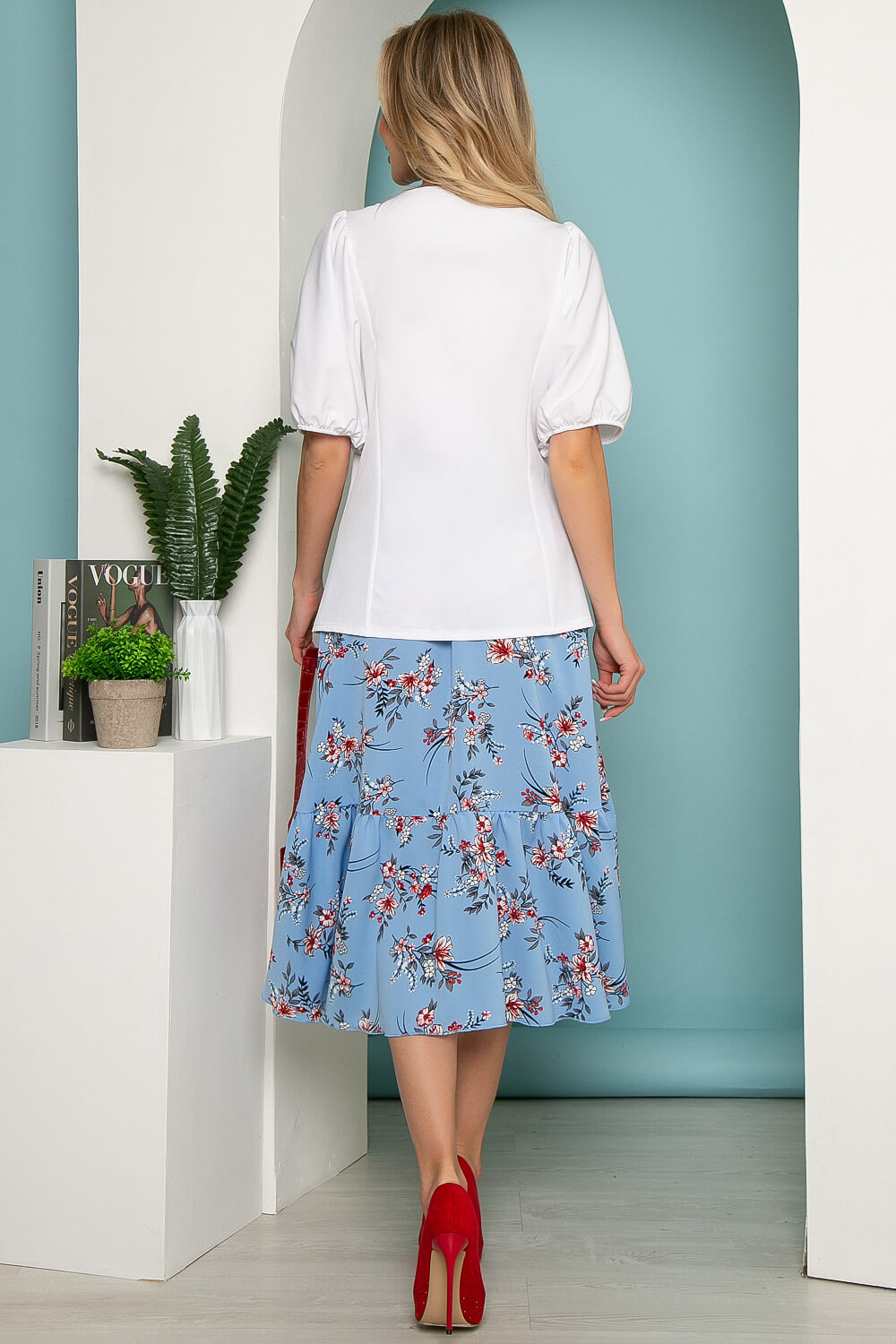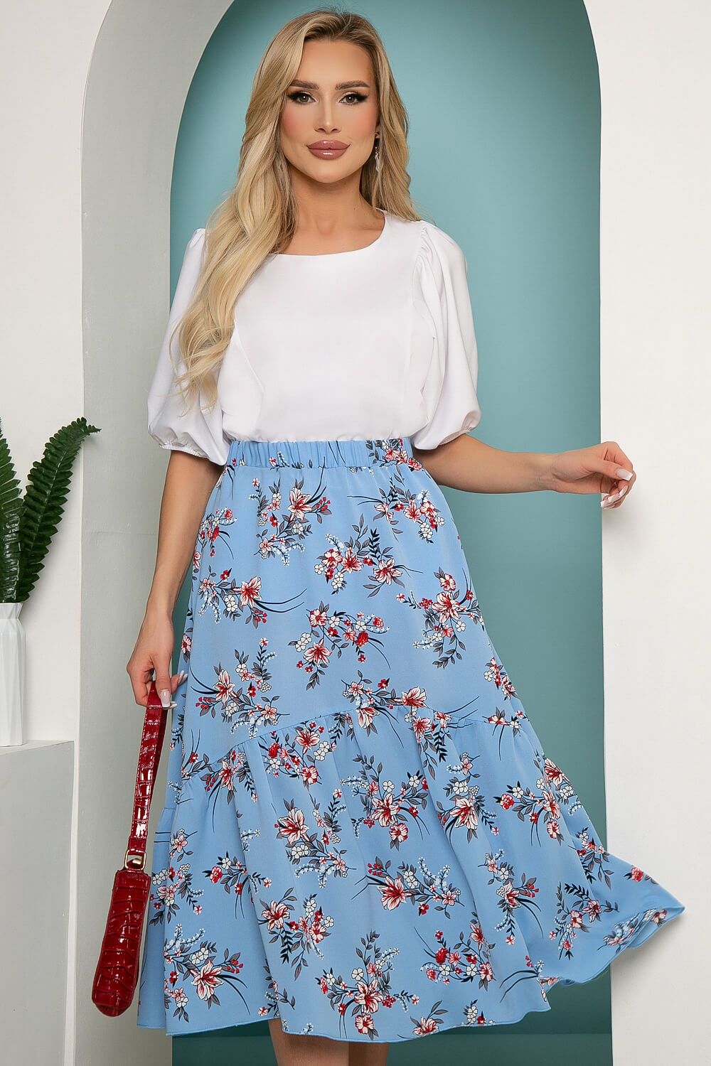 Очаровательный костюм из двух предметов: летящей юбки и блузы. Блуза свободного кроя. Мягкий, округлый вырез горловины, рукав втачной, скроен по типу "фонарик". Юбка с высокой посадкой, на резинке, А-силуэта, по низу волан на сборке с переходом длины.