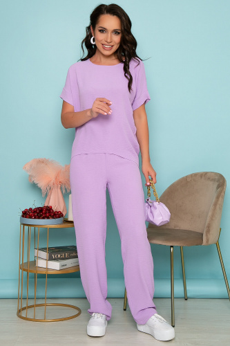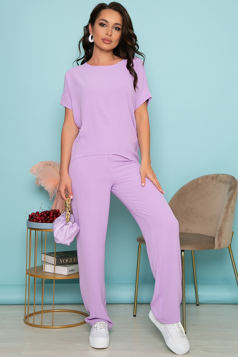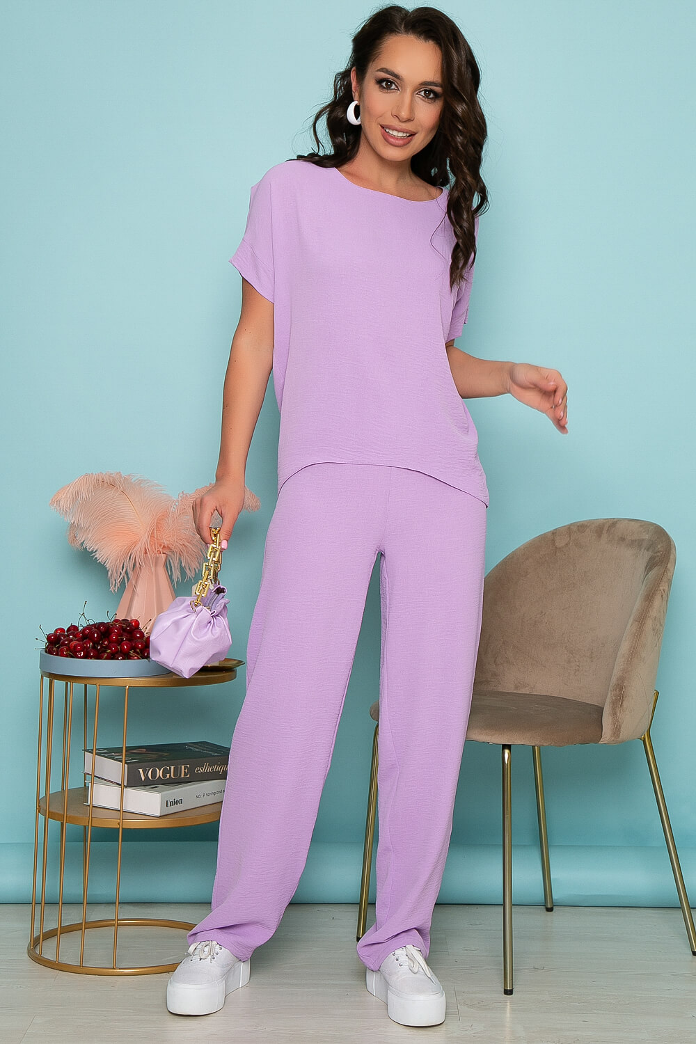 Безупречный костюм в новом нежном сиреневом оттенке. Комплект удобен тем, что Вы сможете миксовать вещи, создавая множество стильных образов каждый день! Комплект состоит из брюк и футболки - он прекрасно дополнит Вашу повседневную капсулу. Свободного кроя брюки, талия на резинке. Без замков. Футболка свободного силуэта. Рукав цельнокроеный, круглый вырез горловины;